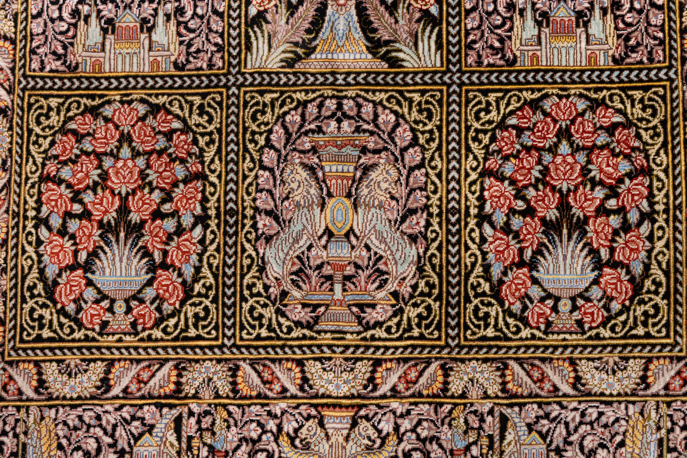 A Persian silk rug stands for pure luxury. This rug in particular, since Qom (also called Qum) silk rugs are known to be the most sophisticated and to count among the finest Persian rugs. Only a skilled master is able to craft such a rug, which easily takes over one year work time. The natural silk from this area is highly popular and said to be the highest-quality silk ever made. It has a most beautiful shine and is even sufficiently robust for frequented rooms.