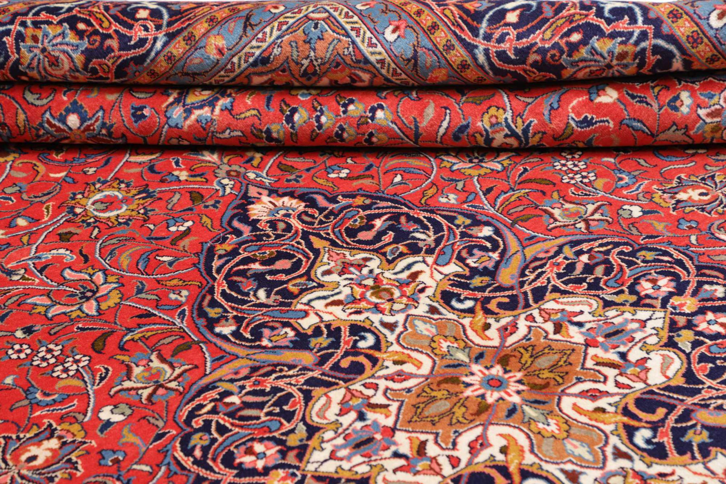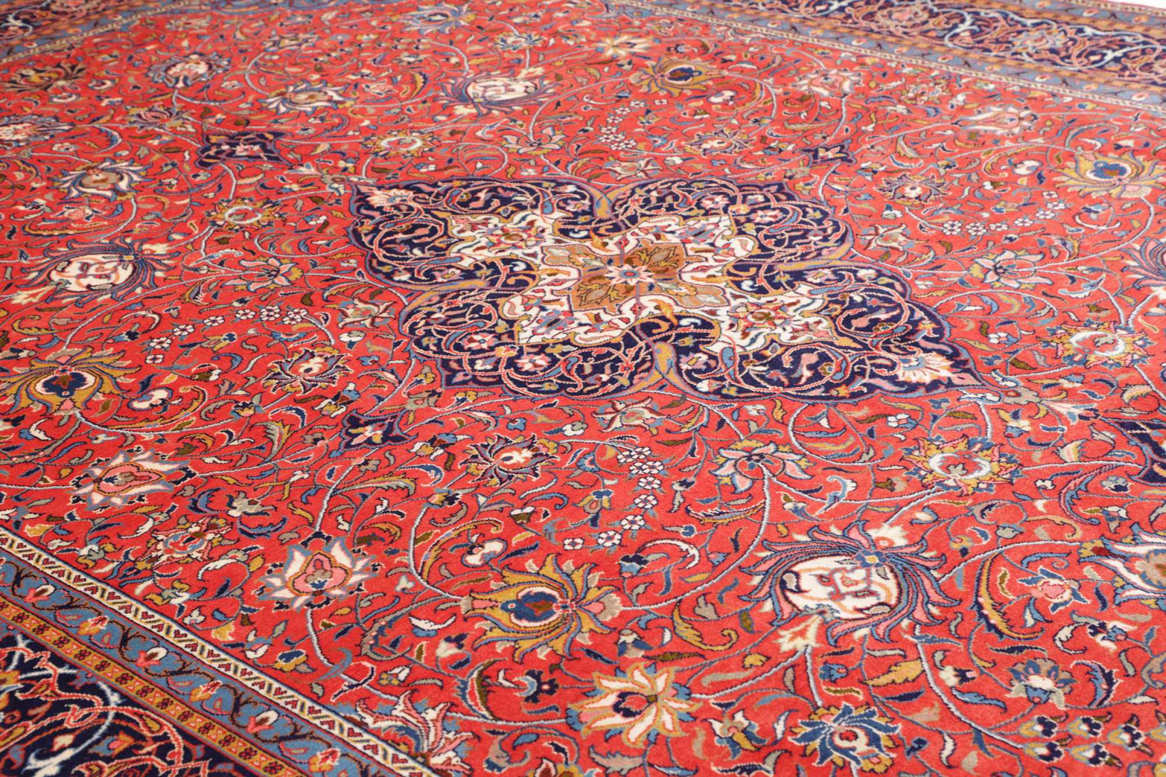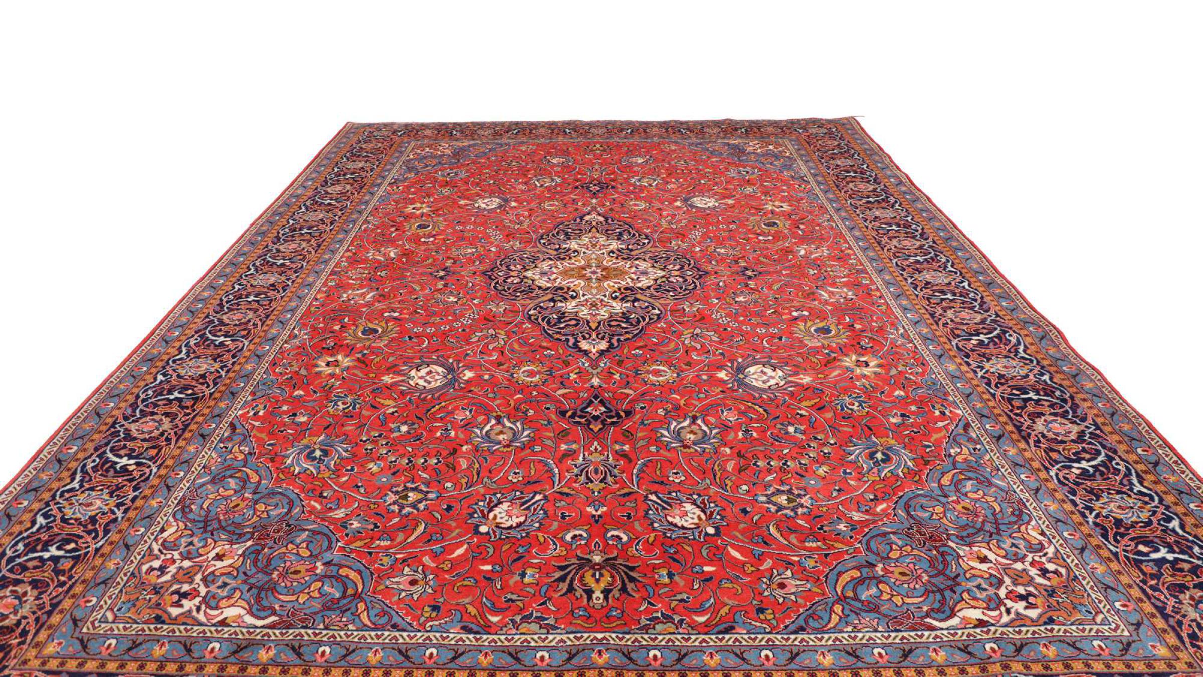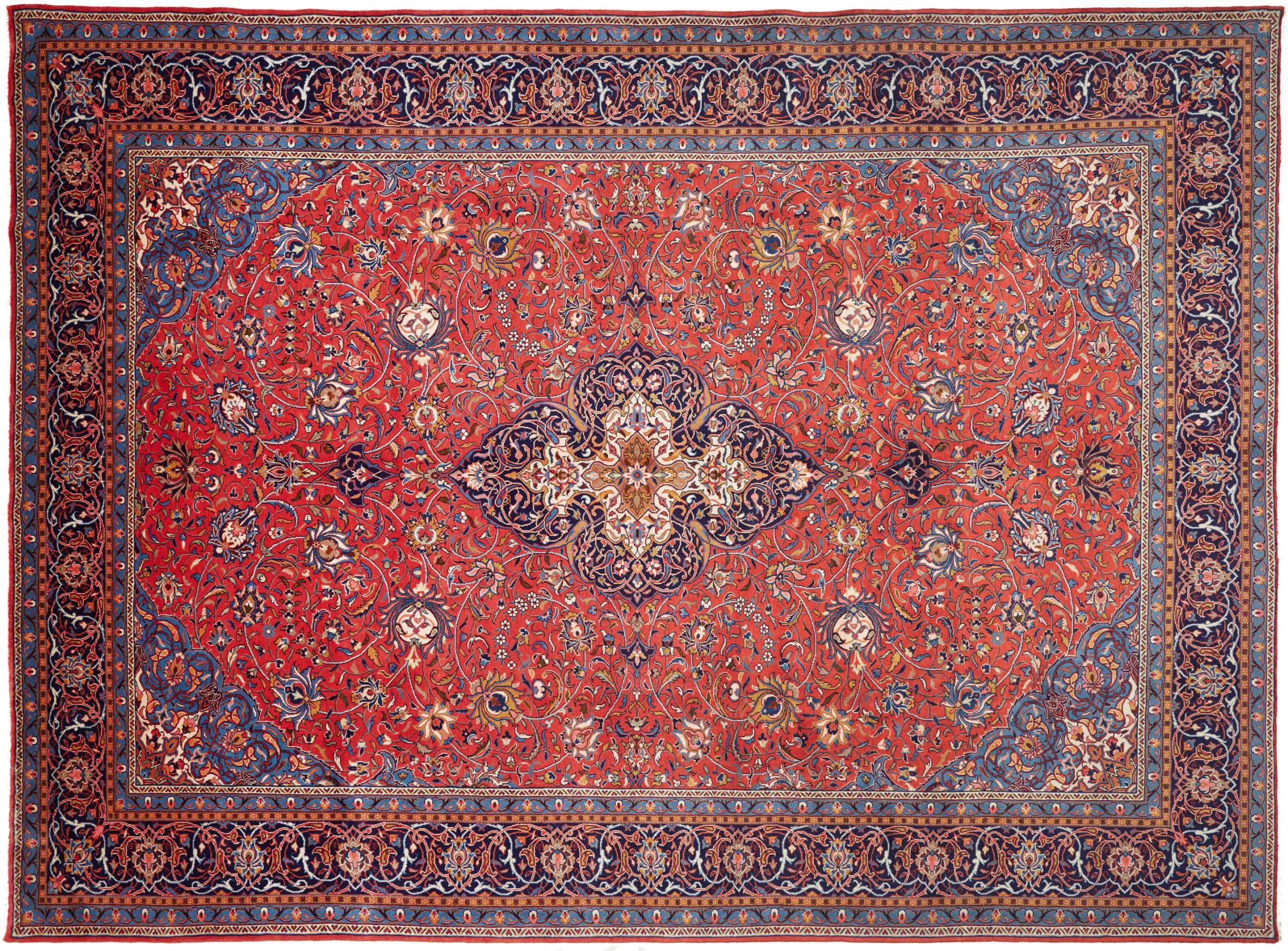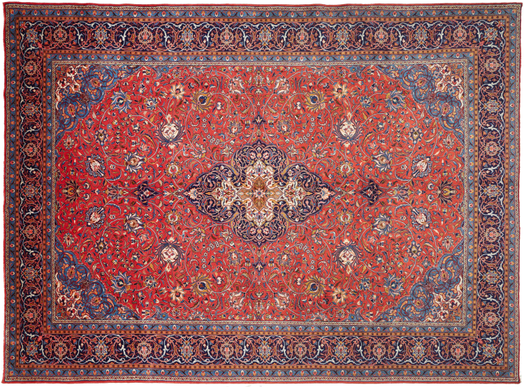 Rug ID: 306221004939904 Size: 13'5"x9'10" ft Thickness: ap. 0.47 in Knot density: 82 - 103 / square inch Manufacturing: Knotted by hand Pile: Handspun wool Warp: Cotton Origin: Persia / Iran Age: New Weight: ap. 95 lb Also know as Arak , Sarough, Sarouk, Saruk, Saroq, Sultanabad In stock: Unique - Only 1 in stock