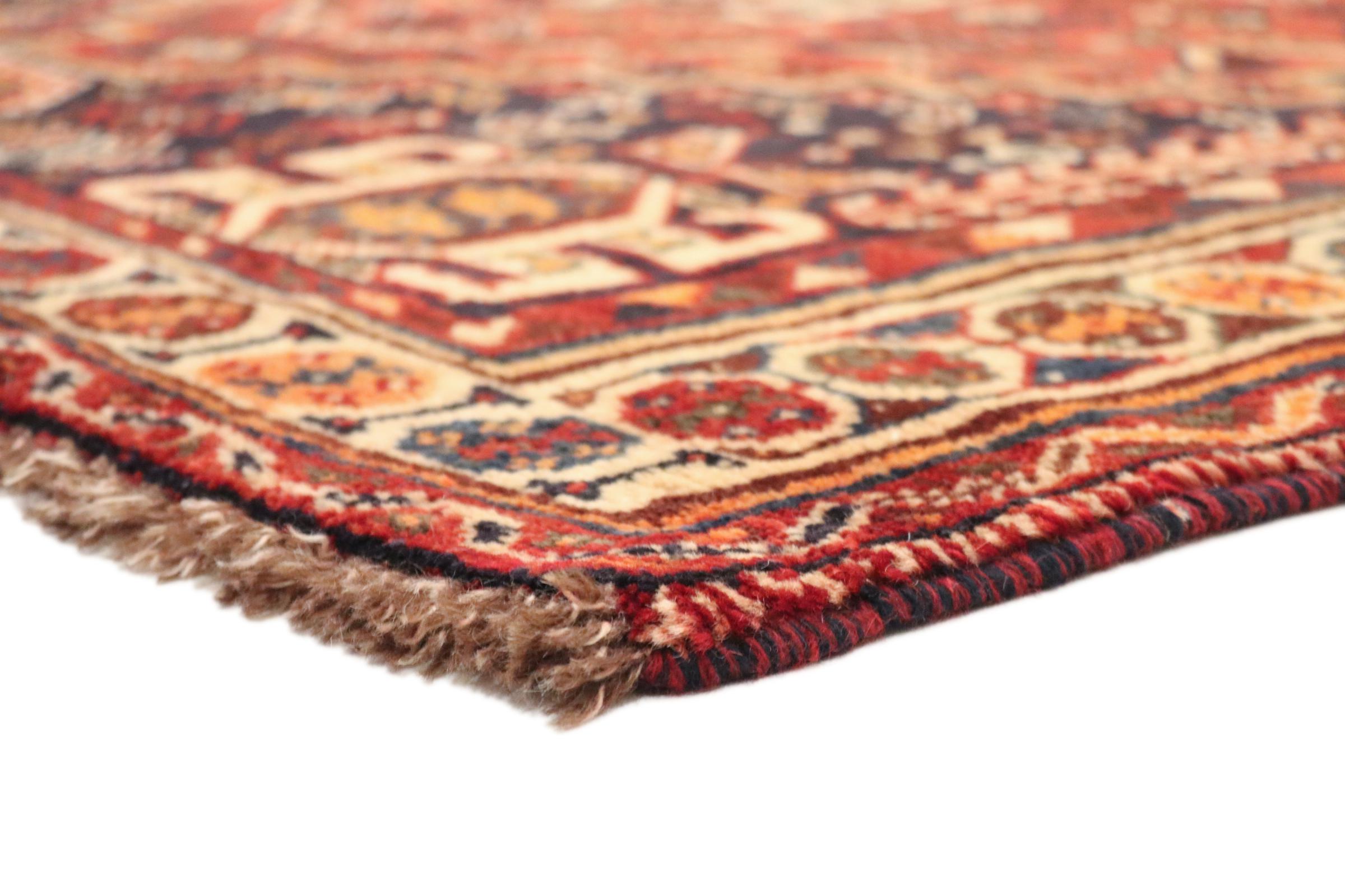 This carpet belongs to the village and nomadic carpets from Iran, the former Persia. This kind of carpets is hand knotted in smaller towns and villages in ancient tradition. Even nomads still knot Persian carpets in the open air. The carpets are knotted without a draft and entirely from memory. They are characterized by classical ornaments arranged in linear and geometric patterns. Thanks to their cultural and traditional origins, these rugs possess a unique character that embodies ancient Persia.