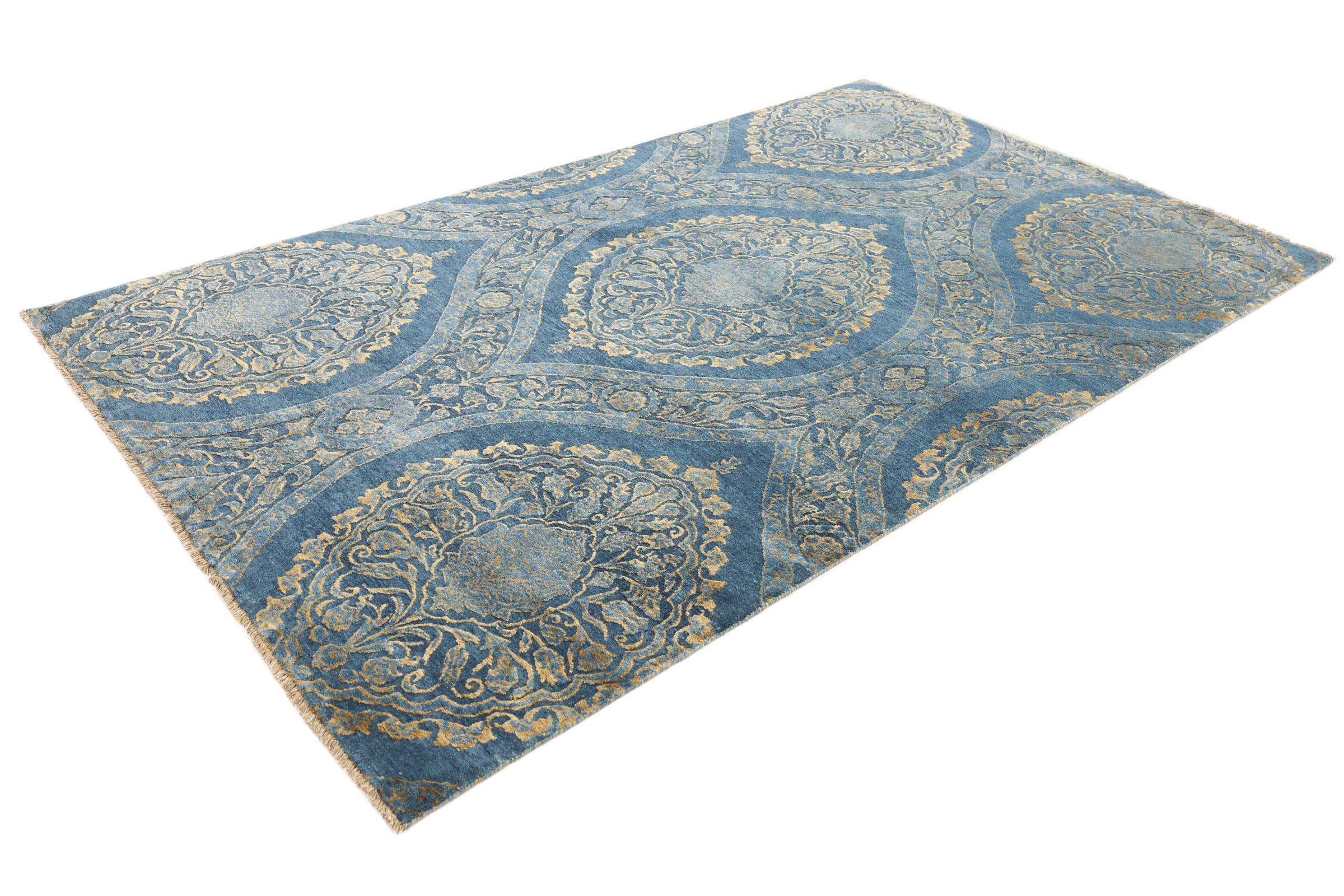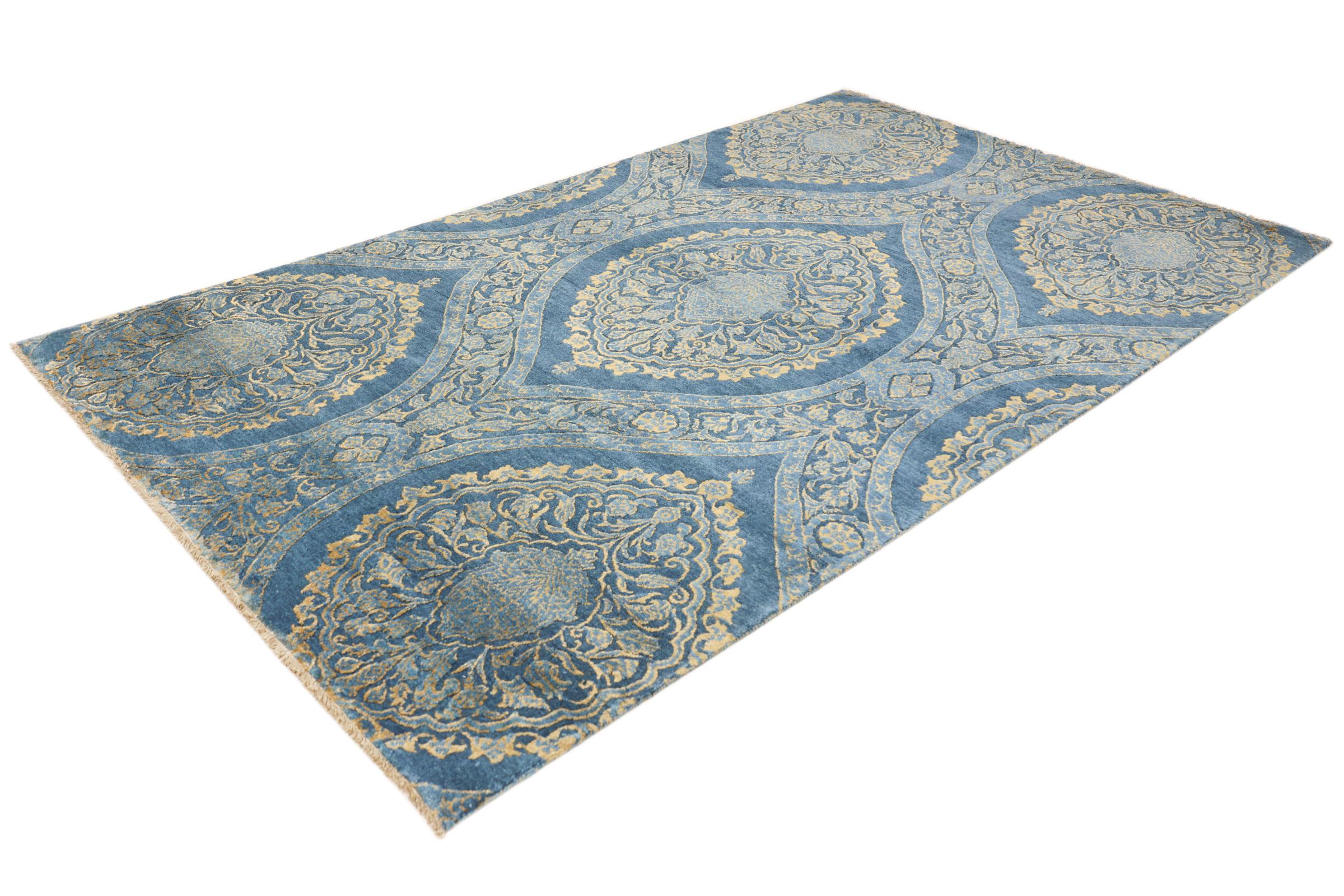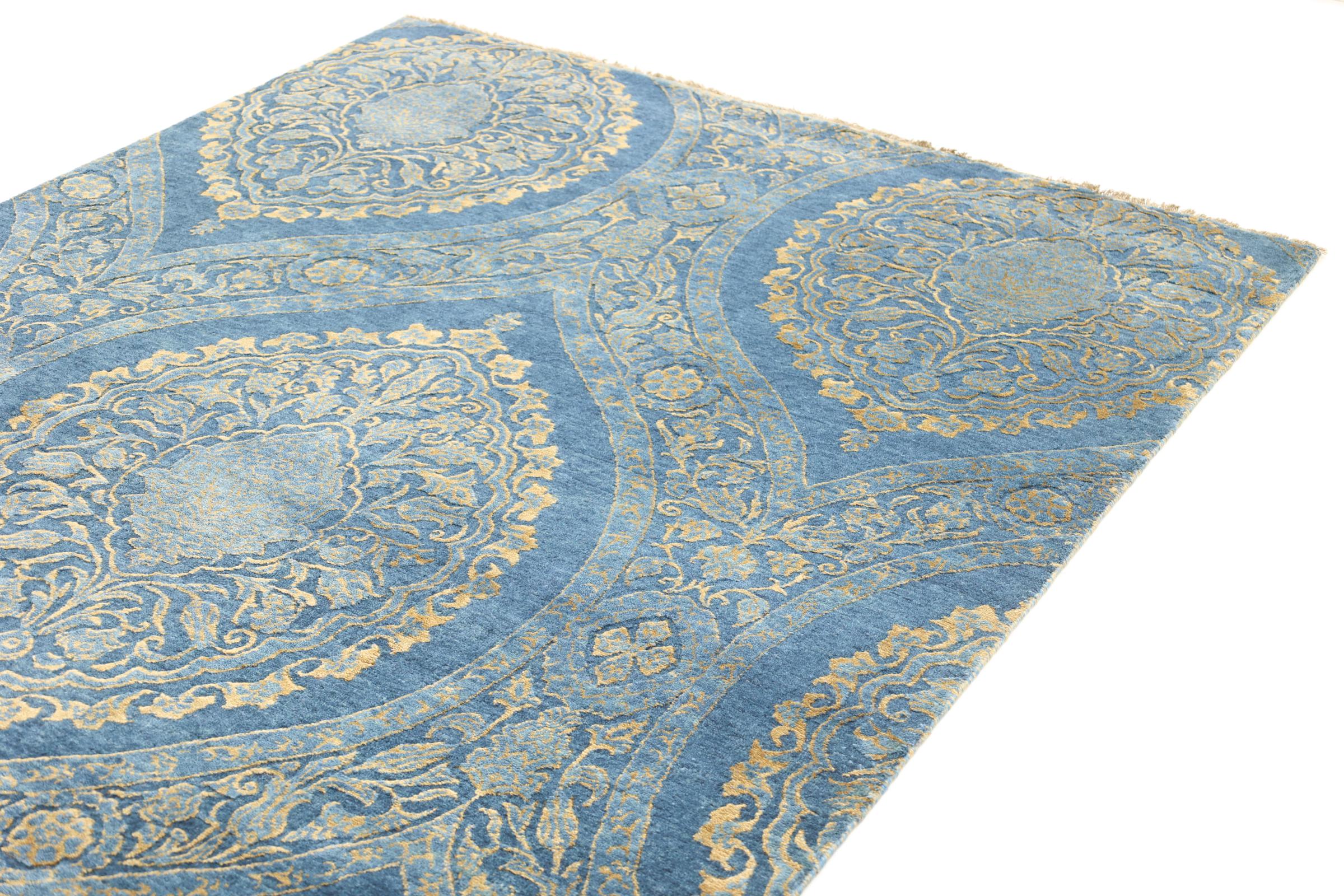 Rug ID: 1682250030123 Size: 8'8"x5'4" ft Thickness: ap. 0.47 in Knot density: 82 - 103 / square inch Manufacturing: Knotted by hand Pile: Wool with bamboo-silk Warp: Cotton Origin: India Age: New Weight: ap. 33 lb In stock: Unique - Only 1 in stock