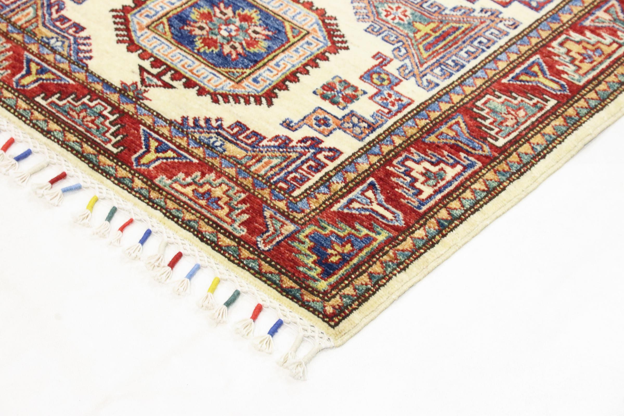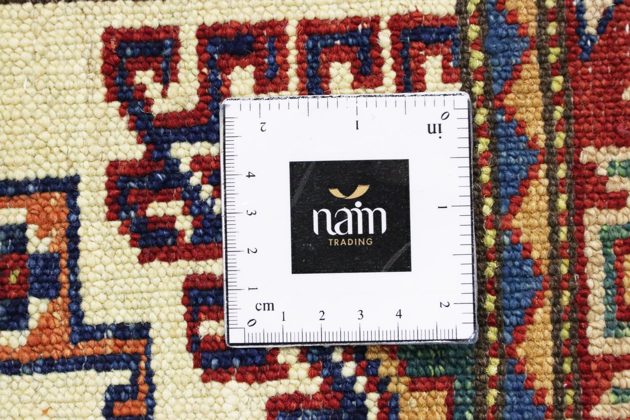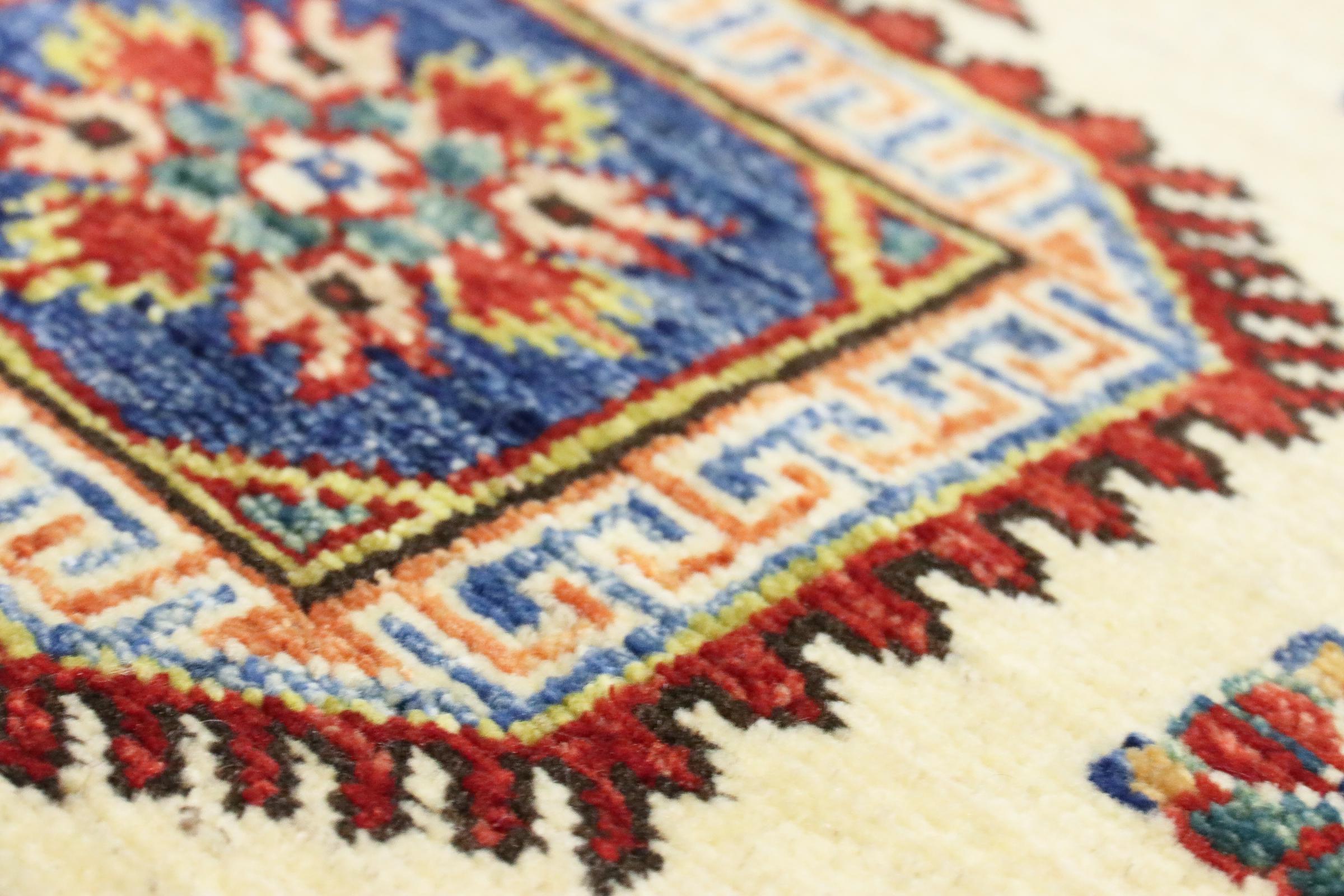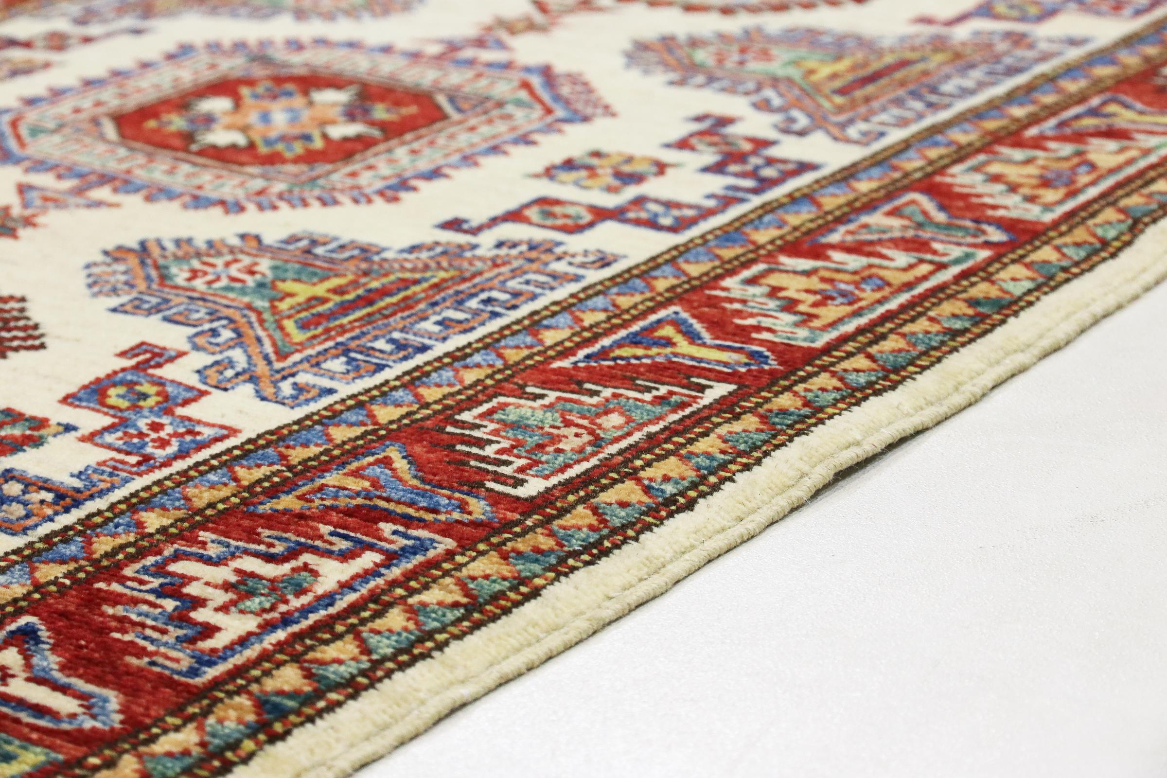 This Kazak rug has been crafted by hand along old tradition. The region of origin is famous for its mountains and the handmade rugs with beautiful shades of red, blue and green. The colors are slightly lightened on this rug, like with most Kazak rugs.