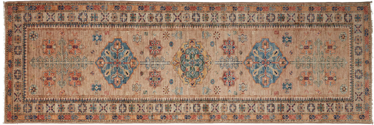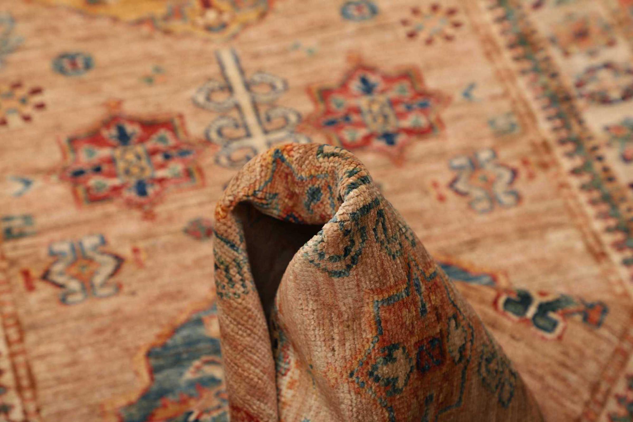 This Kazak rug has been crafted by hand along old tradition. The region of origin is famous for its mountains and the handmade rugs with beautiful shades of red, blue and green. The colors are slightly lightened on this rug, like with most Kazak rugs.