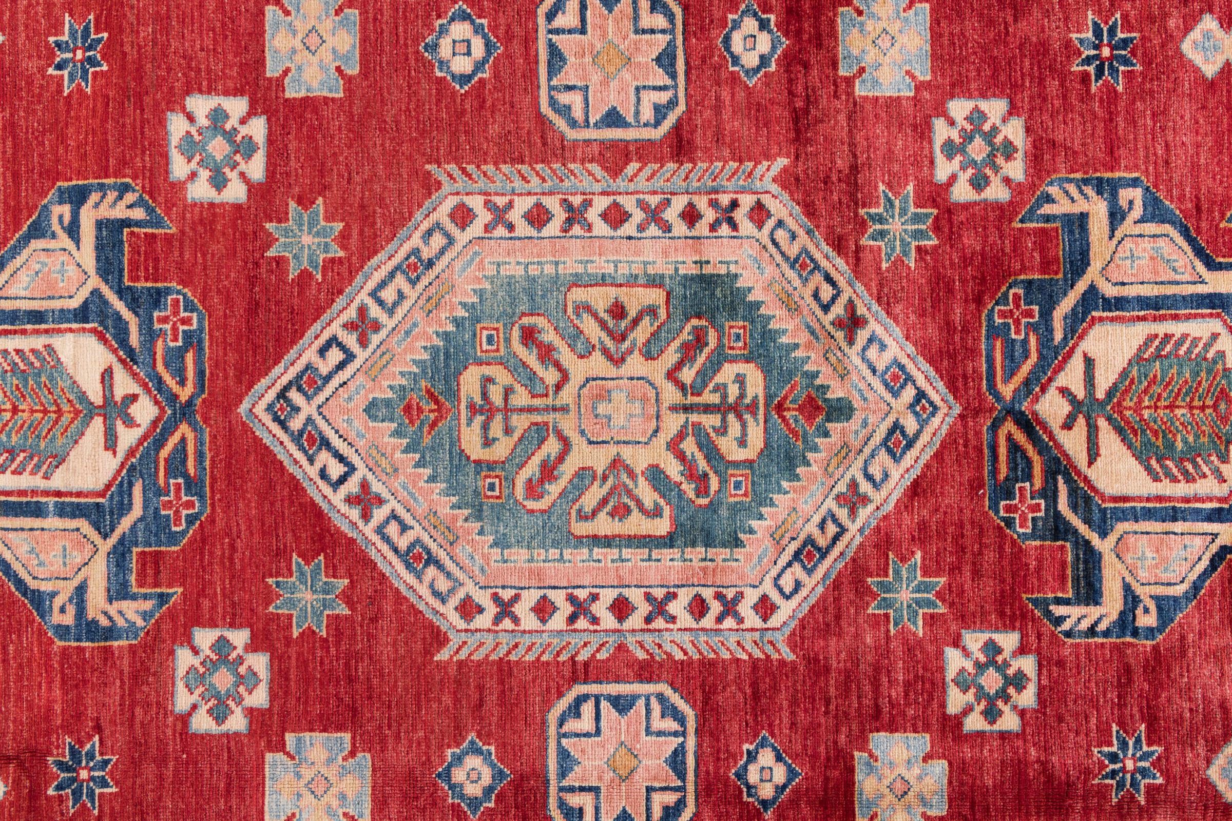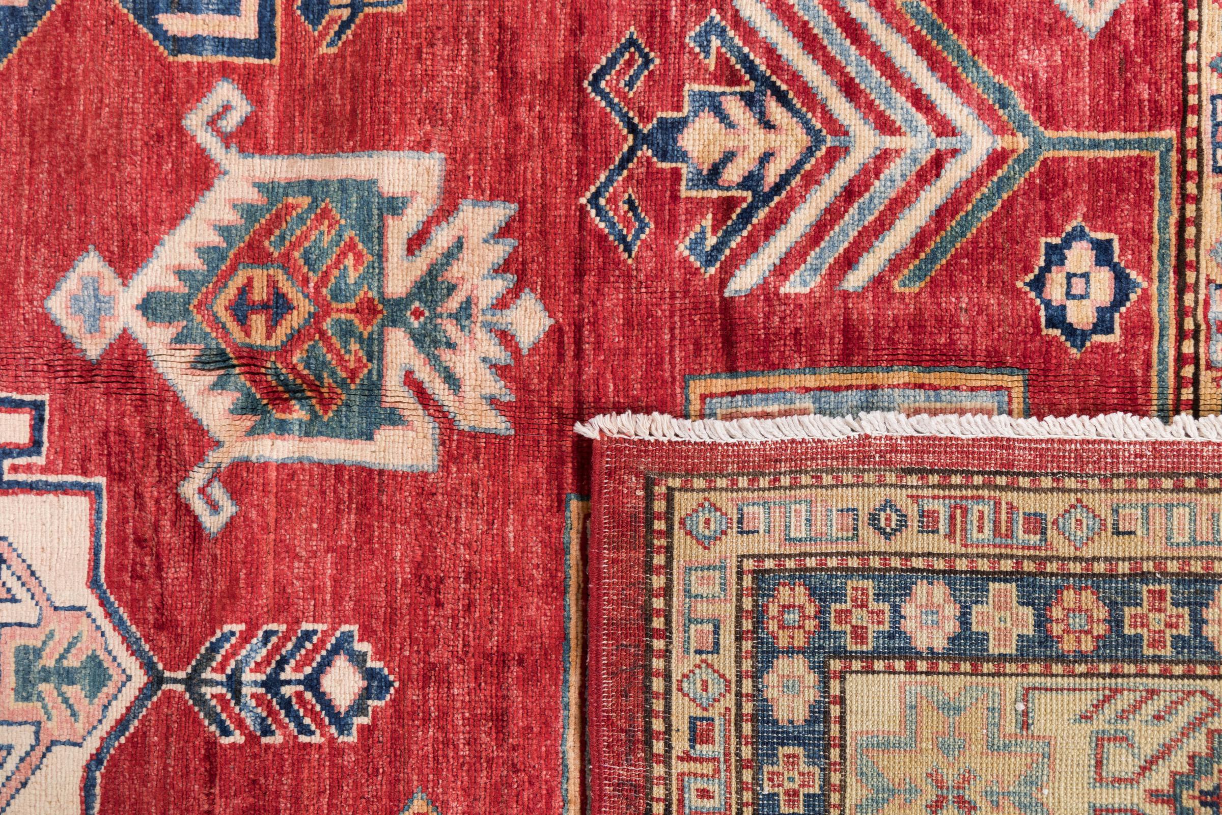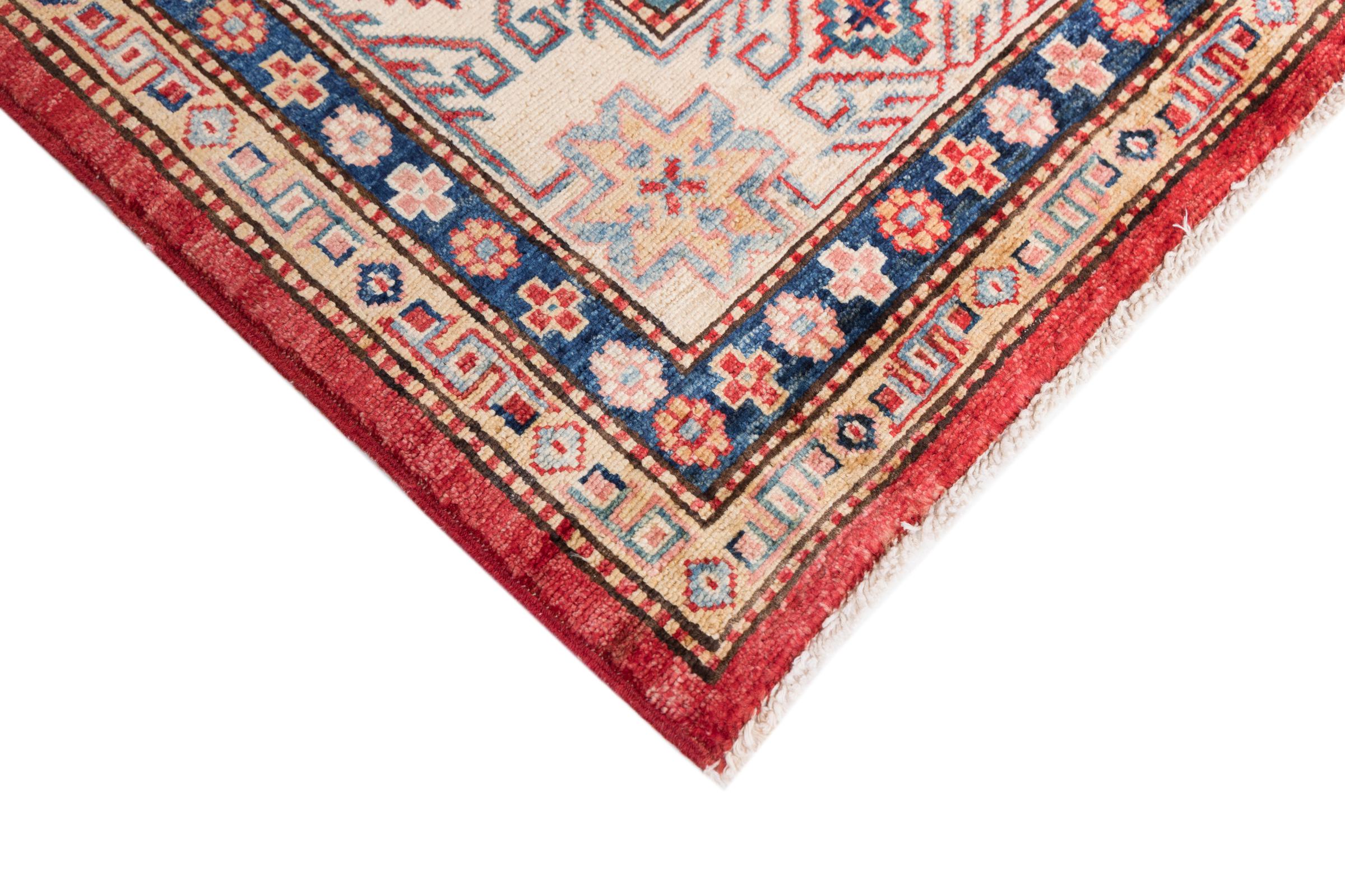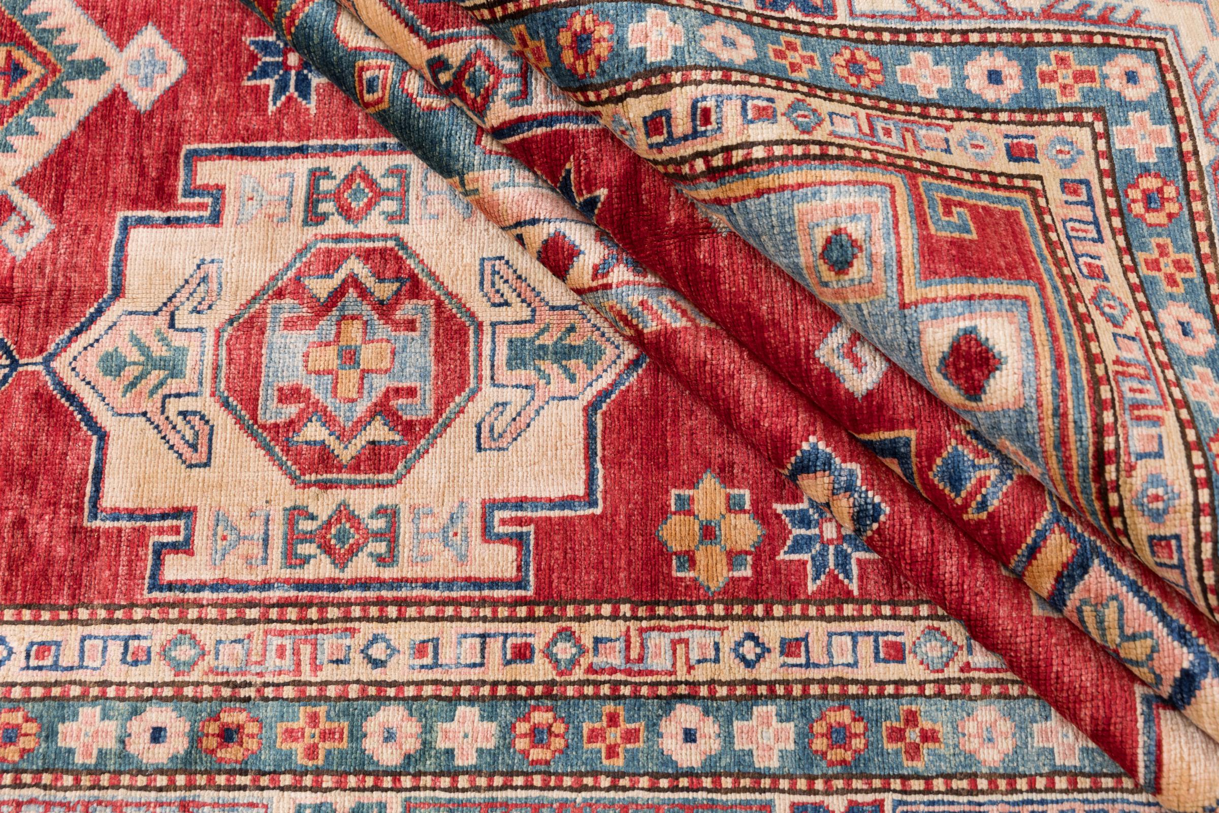 This Kazak rug has been crafted by hand along old tradition. The region of origin is famous for its mountains and the handmade rugs with beautiful shades of red, blue and green. The colors are slightly lightened on this rug, like with most Kazak rugs.