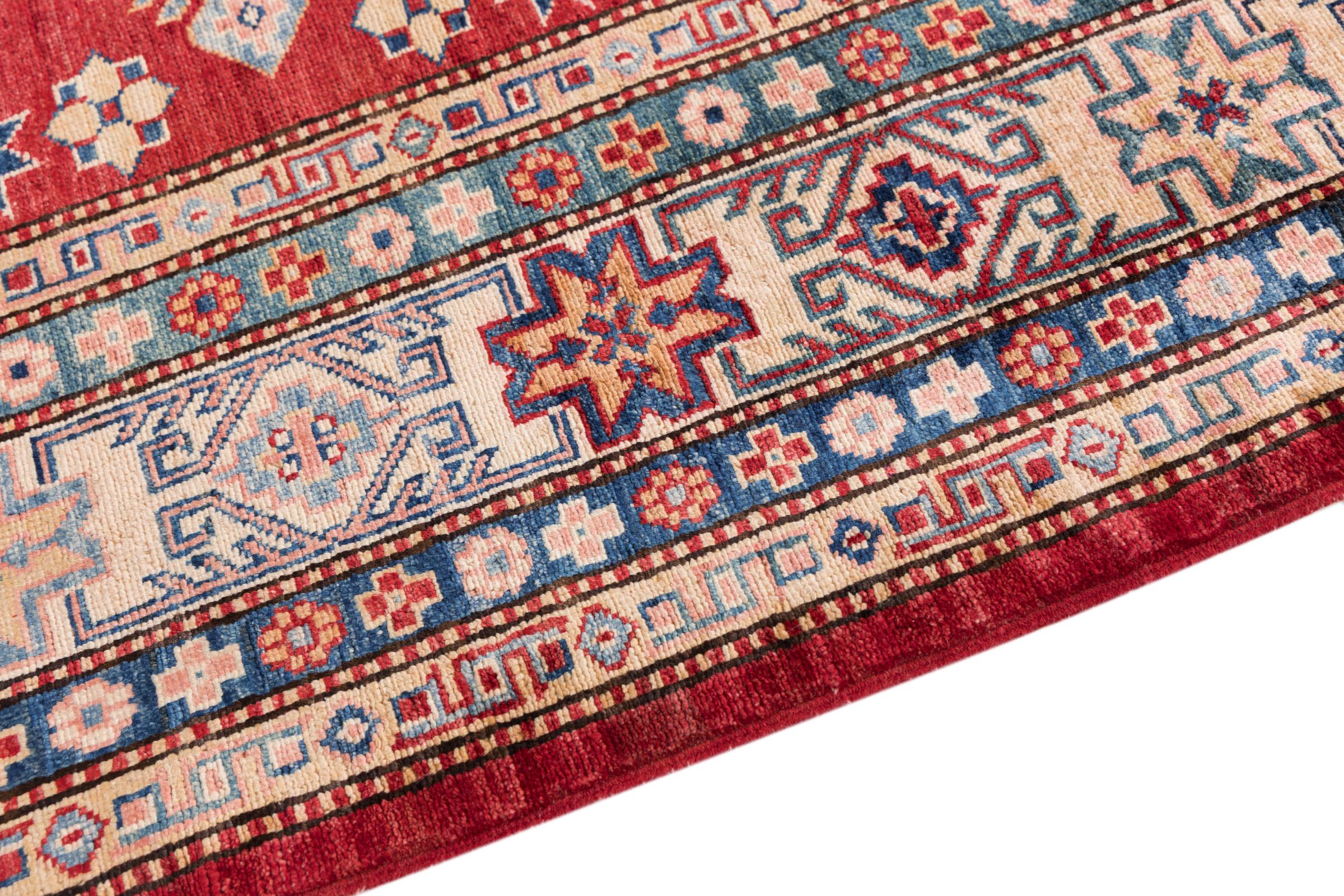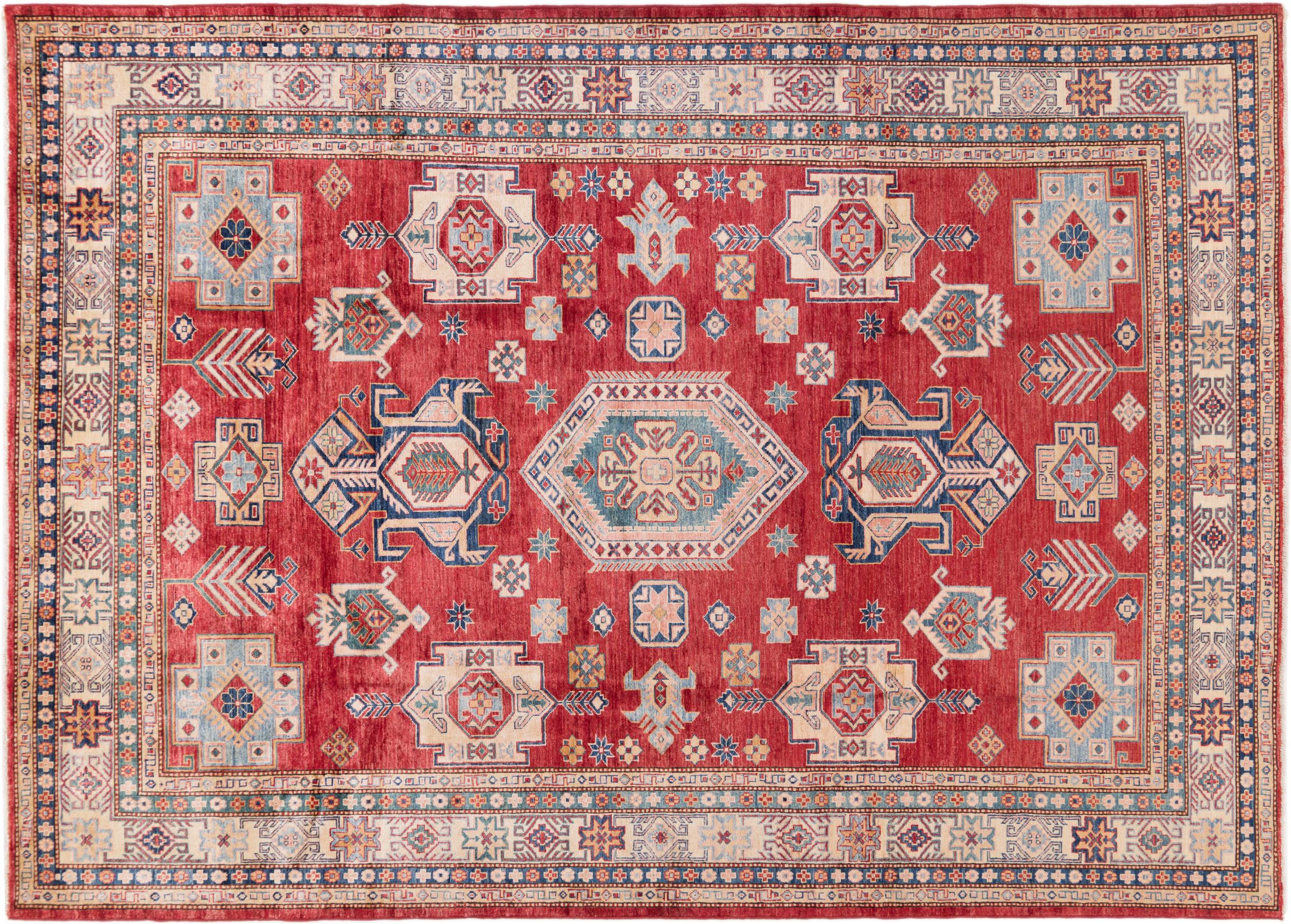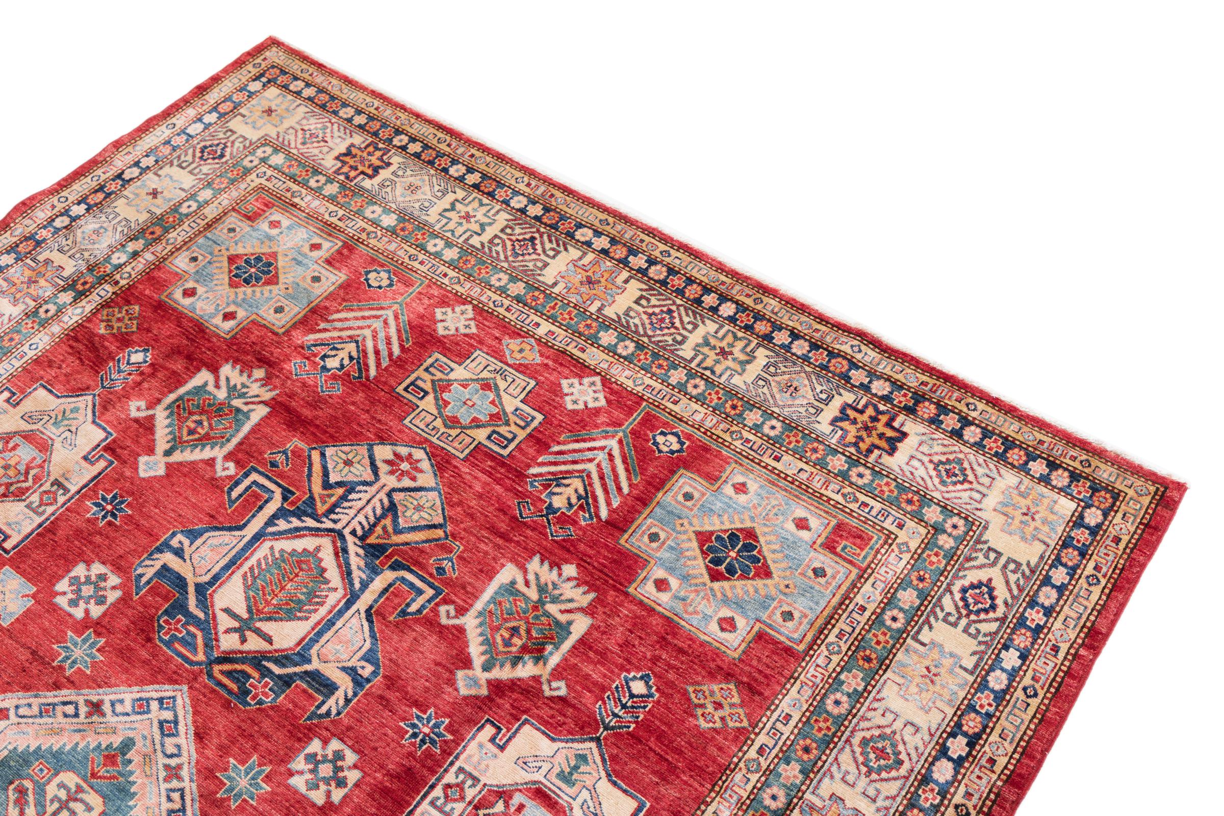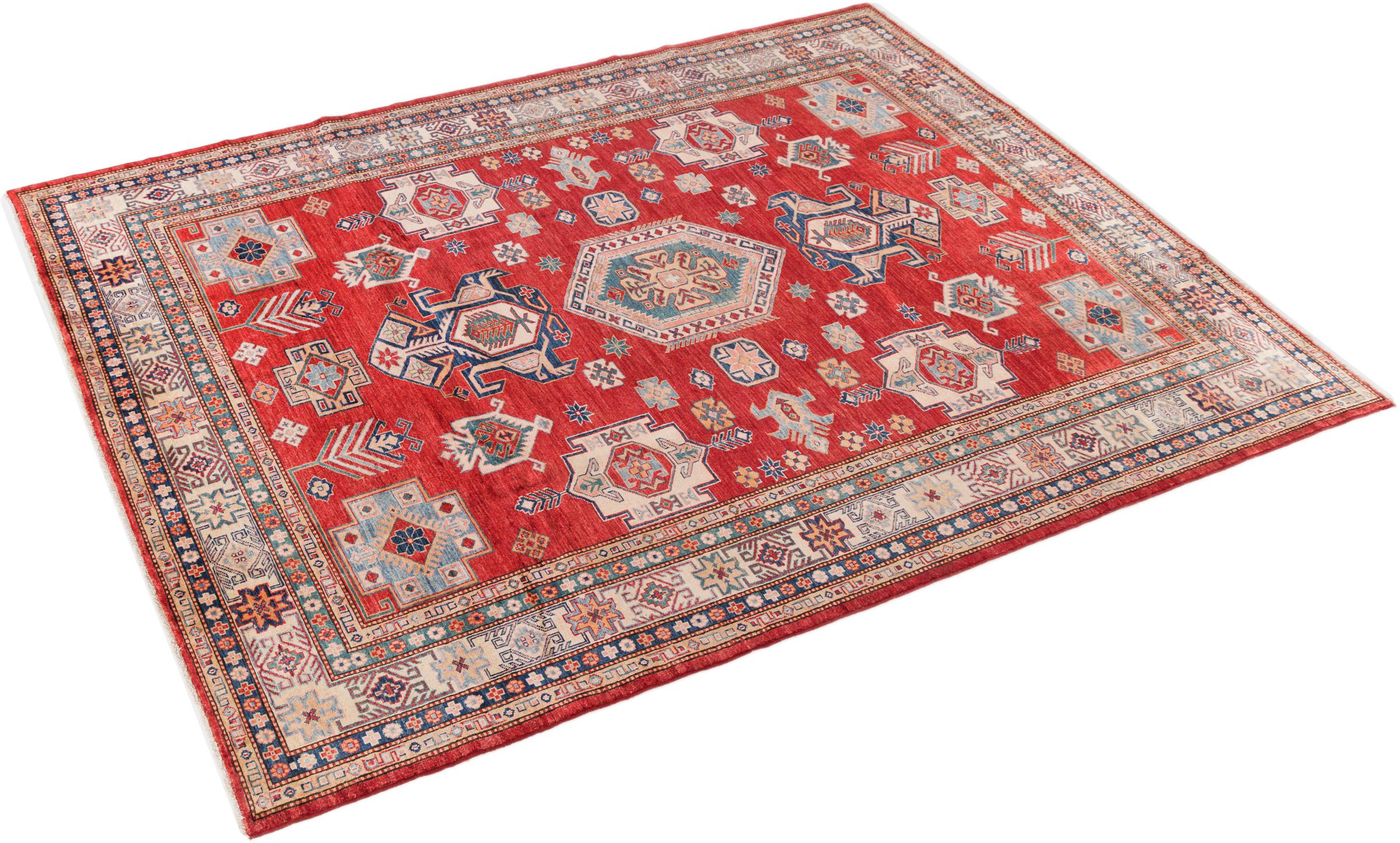 This Kazak rug has been crafted by hand along old tradition. The region of origin is famous for its mountains and the handmade rugs with beautiful shades of red, blue and green. The colors are slightly lightened on this rug, like with most Kazak rugs.
