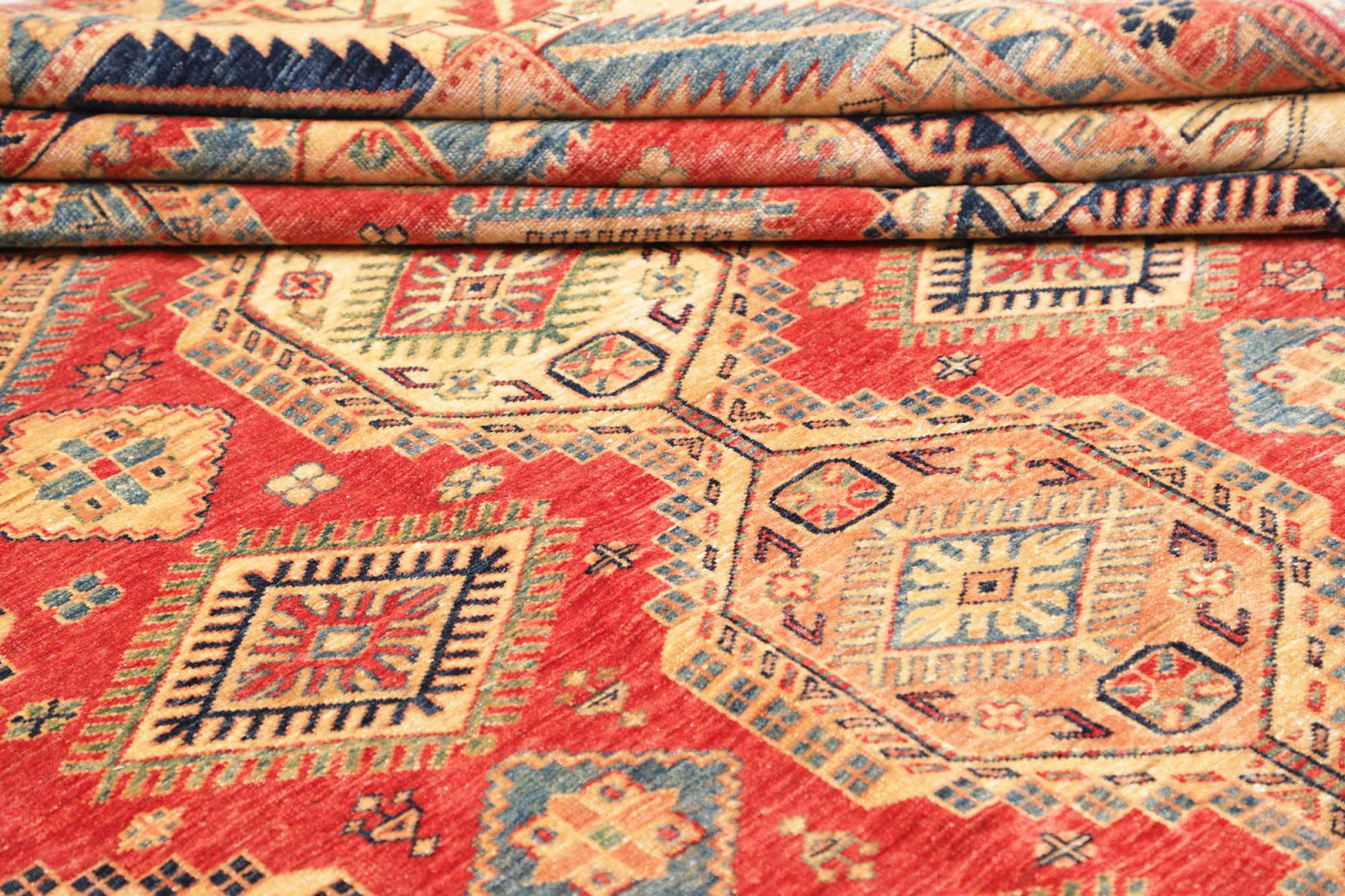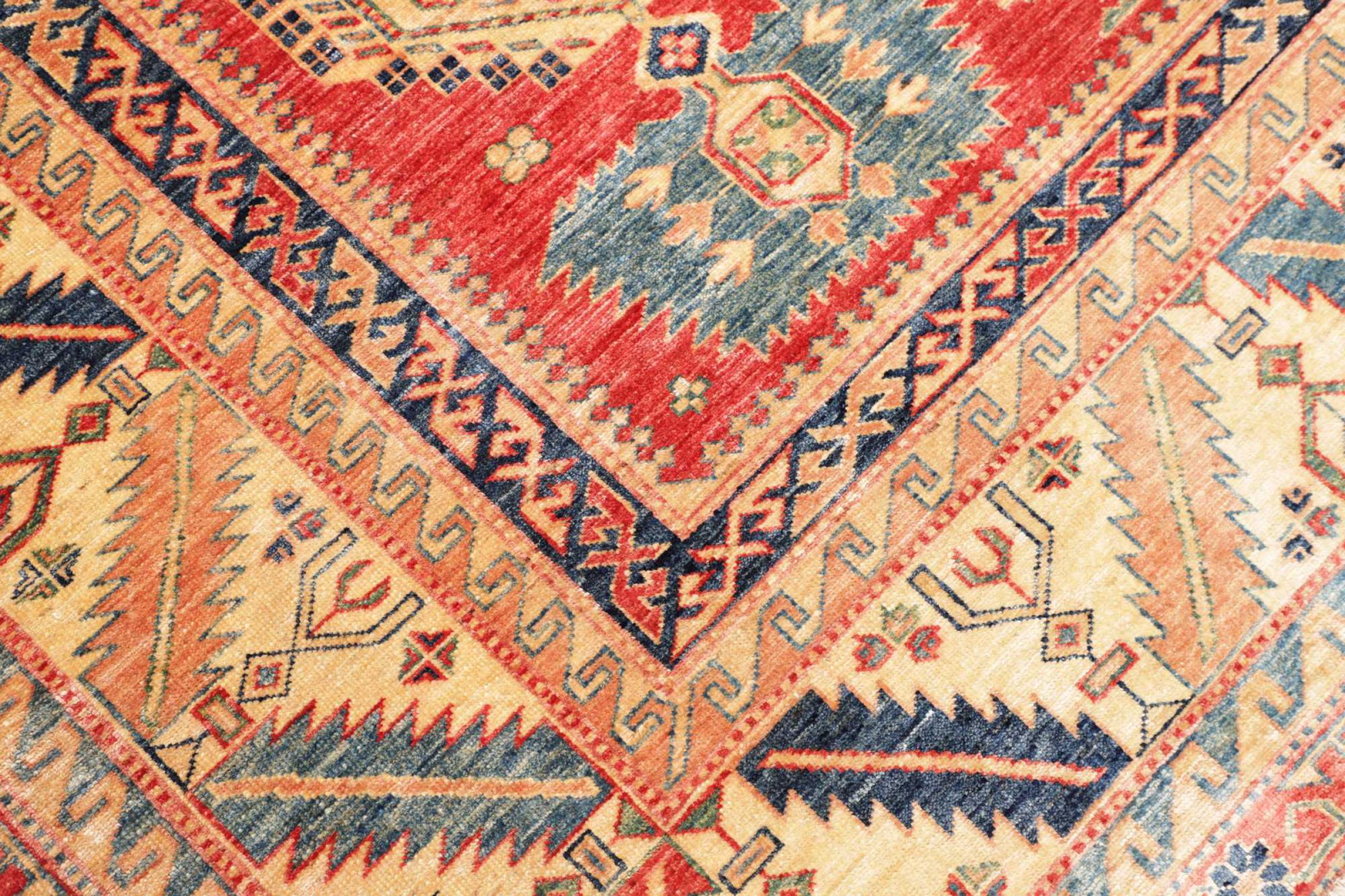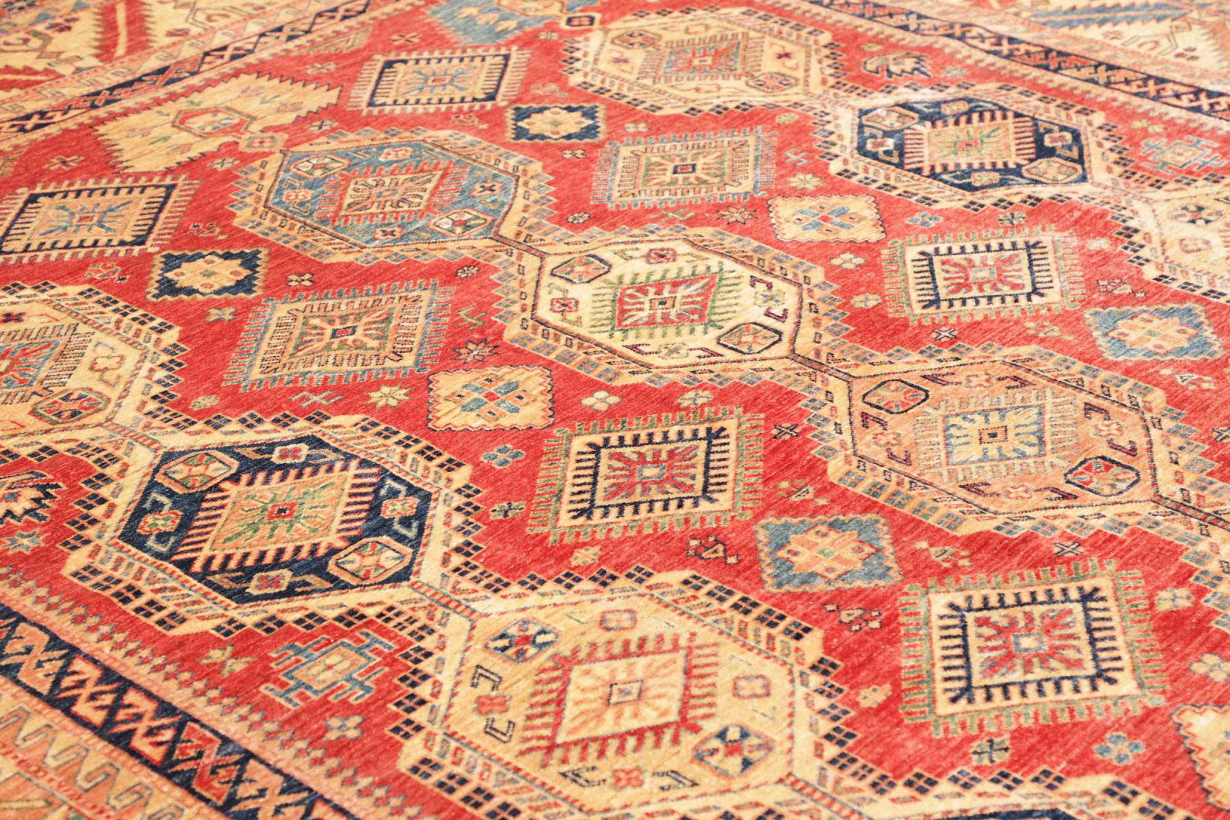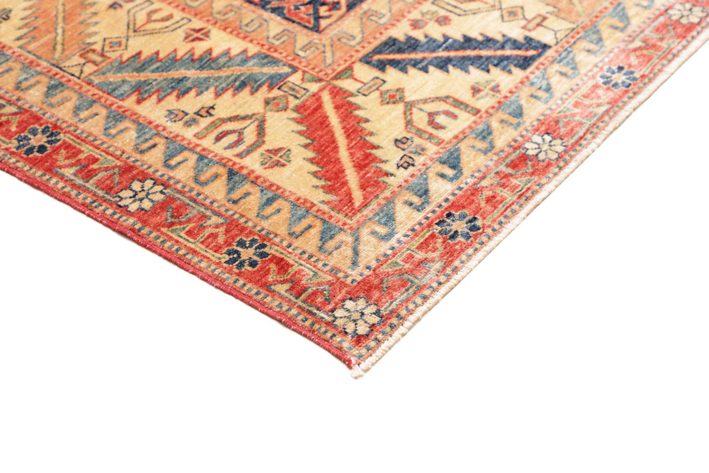 This Kazak rug has been crafted by hand along old tradition. The region of origin is famous for its mountains and the handmade rugs with beautiful shades of red, blue and green. The colors are slightly lightened on this rug, like with most Kazak rugs.
