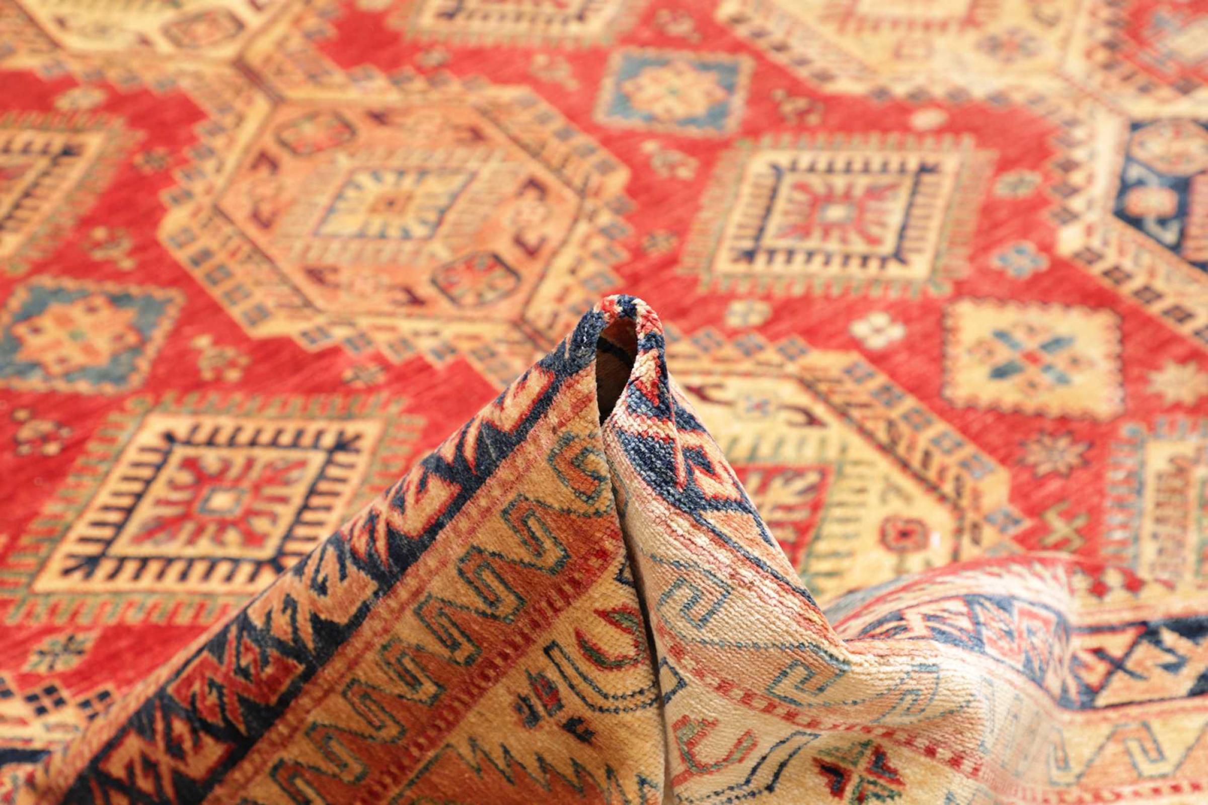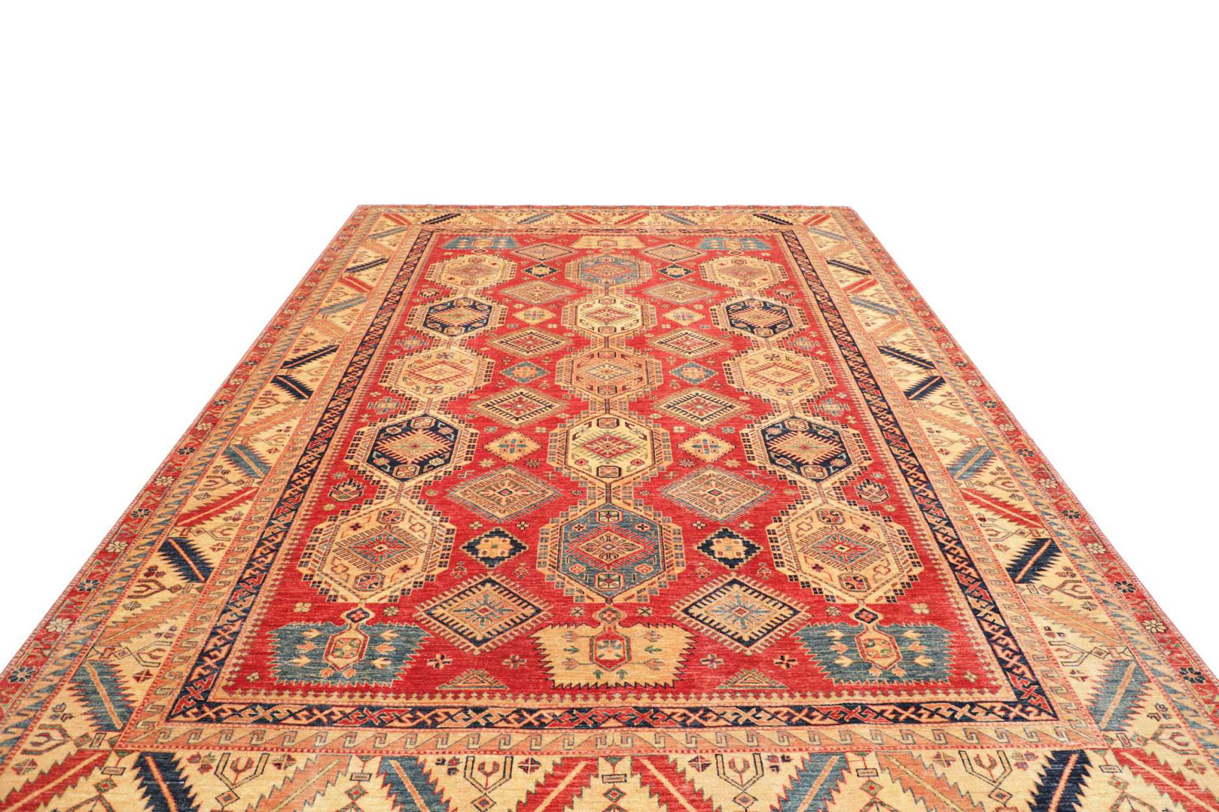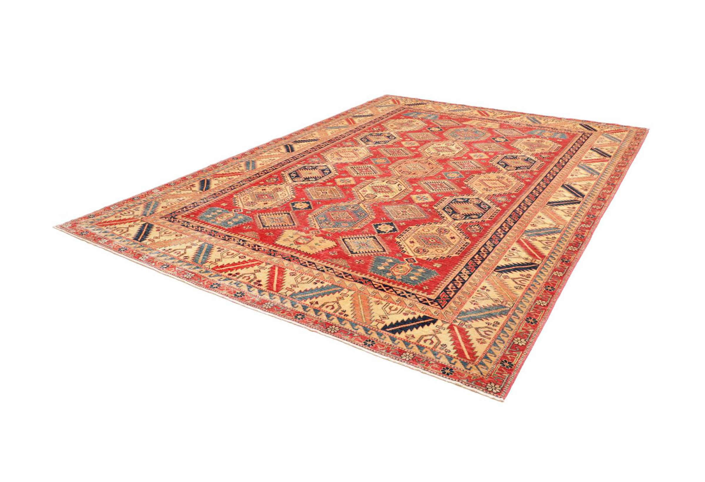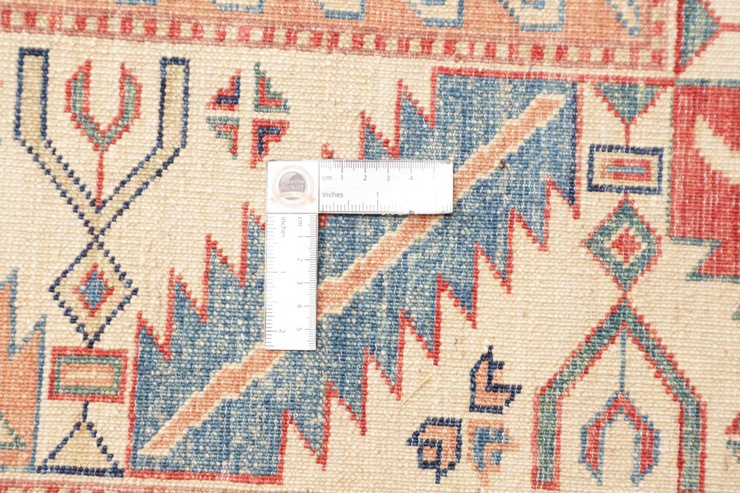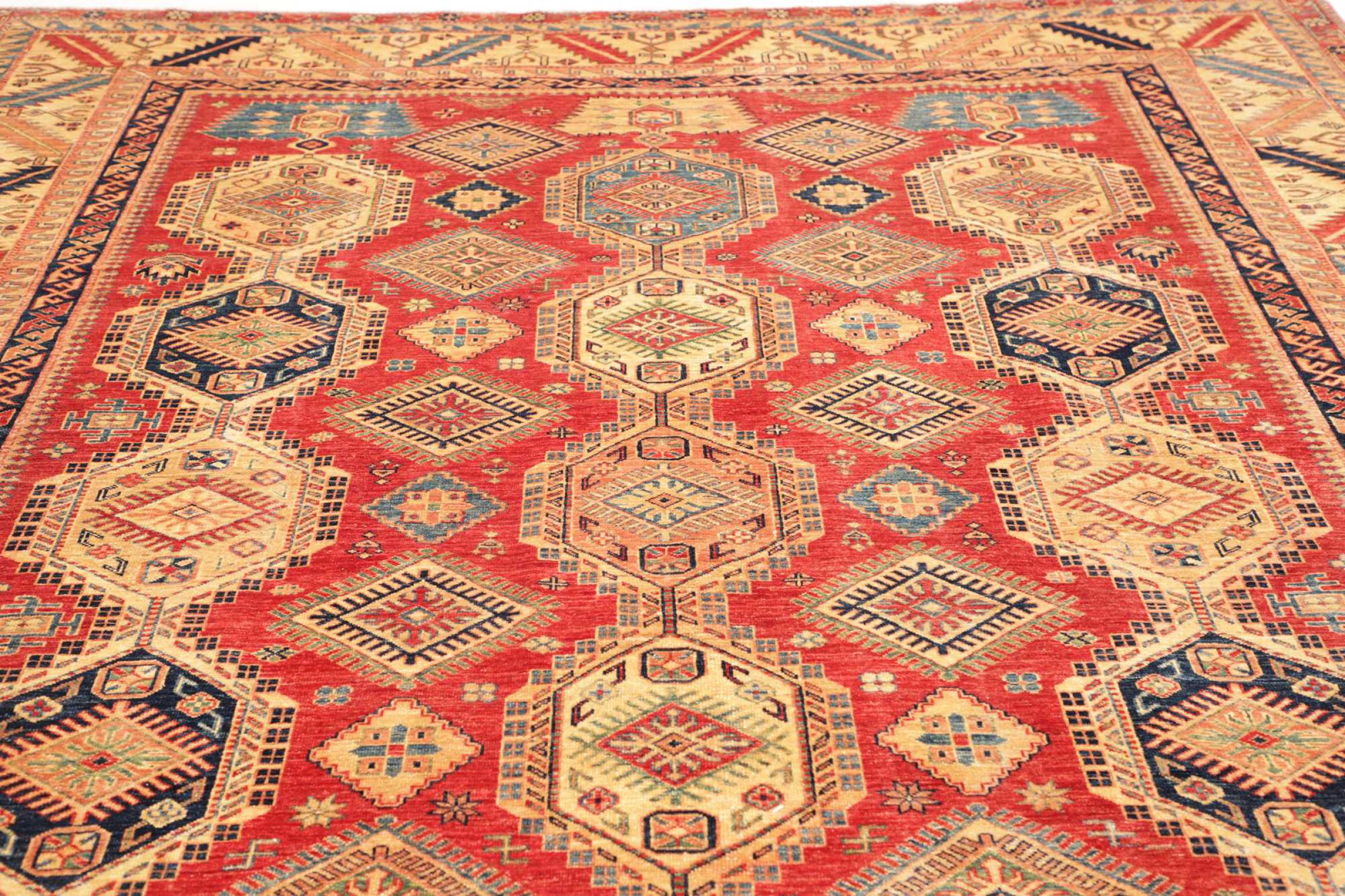 This Kazak rug has been crafted by hand along old tradition. The region of origin is famous for its mountains and the handmade rugs with beautiful shades of red, blue and green. The colors are slightly lightened on this rug, like with most Kazak rugs.