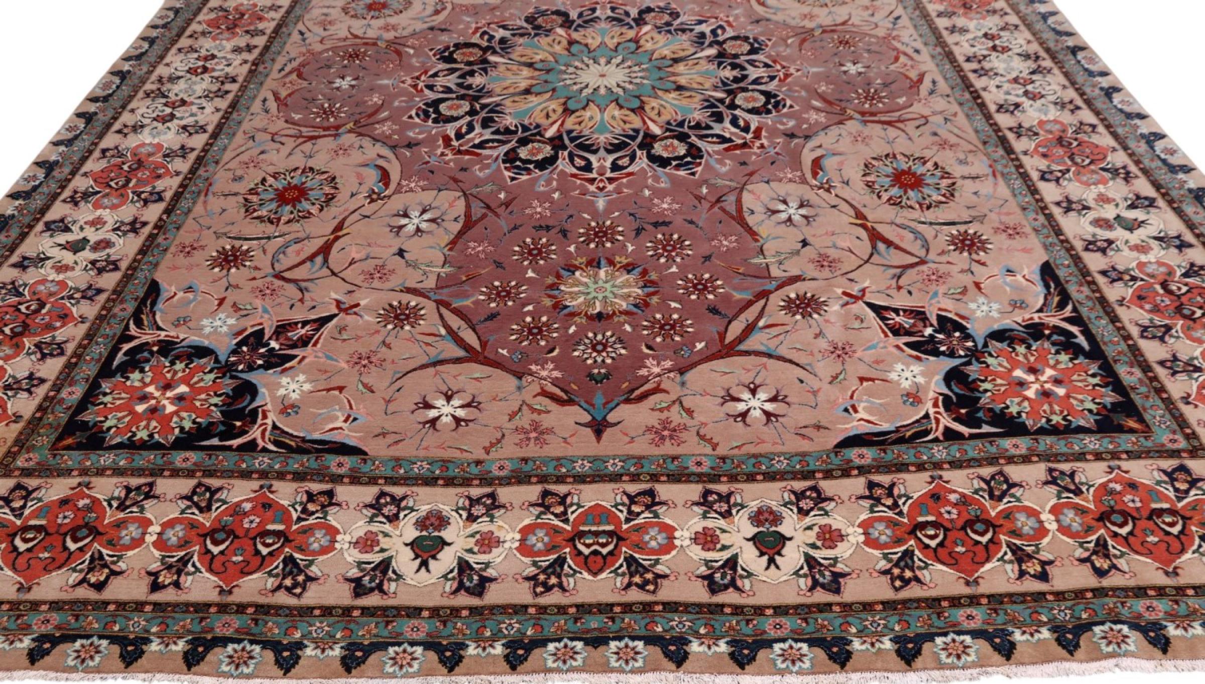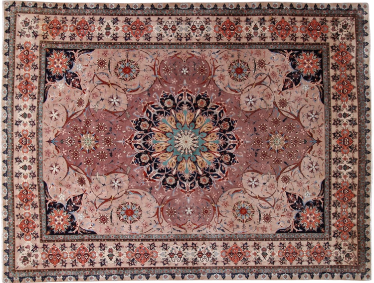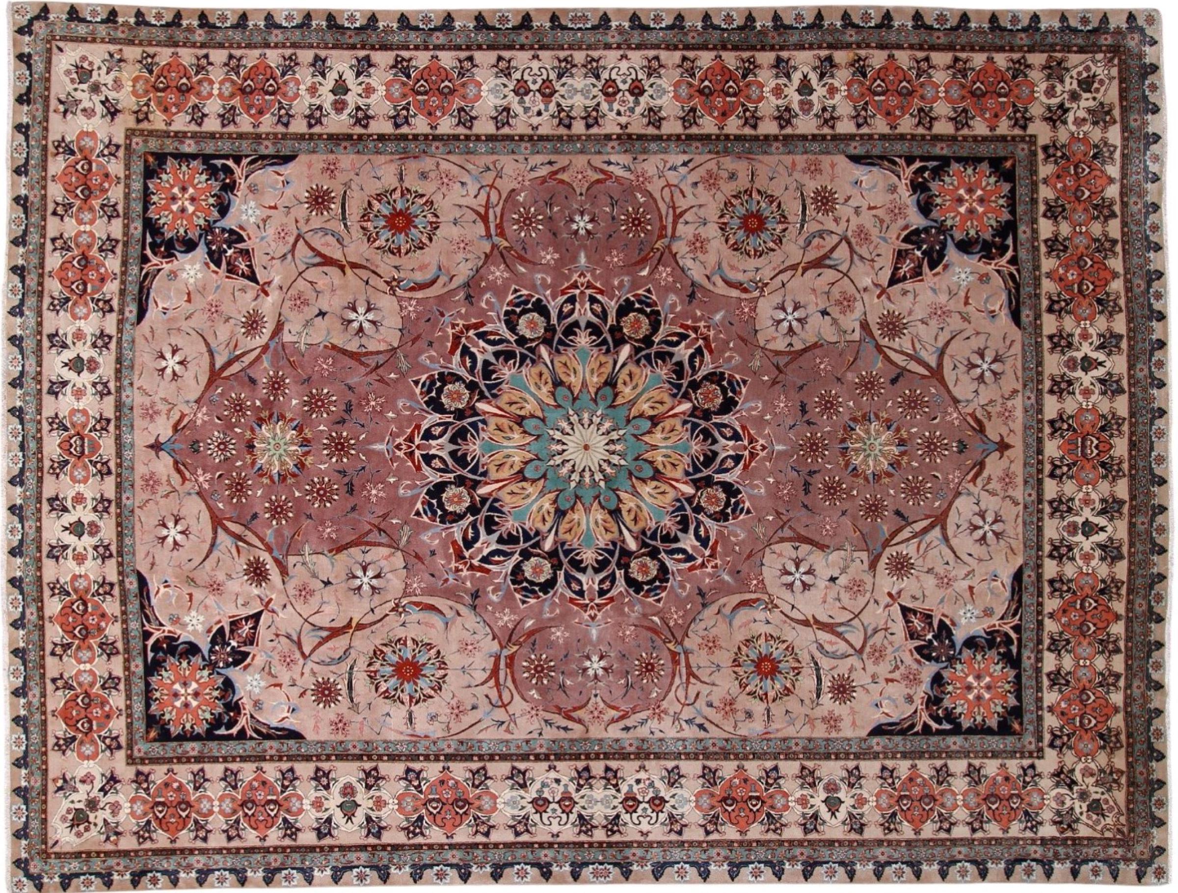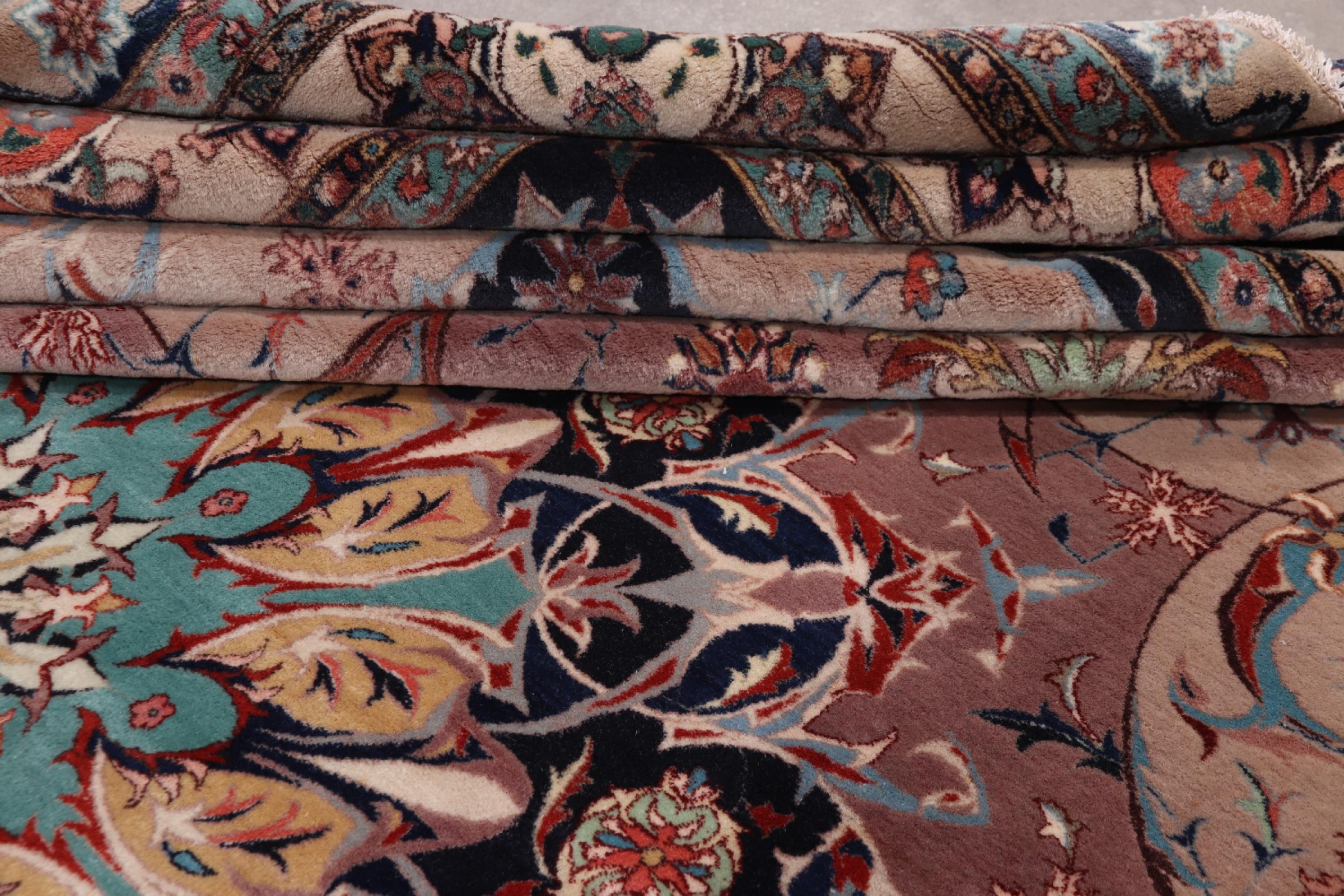 Rug ID: 291986001021856 Size: 12'7"x9'7" ft Thickness: ap. 0.28 in Knot density: 291 - 323 / square inch Manufacturing: Knotted by hand Pile: Wool with silk Warp: Cotton Origin: Persia / Iran Age: New Weight: ap. 75 lb Also know as Tabriz, Tabris, Täbris, Tebriz, Tebris, 40Raj, 50Raj In stock: Unique - Only 1 in stock