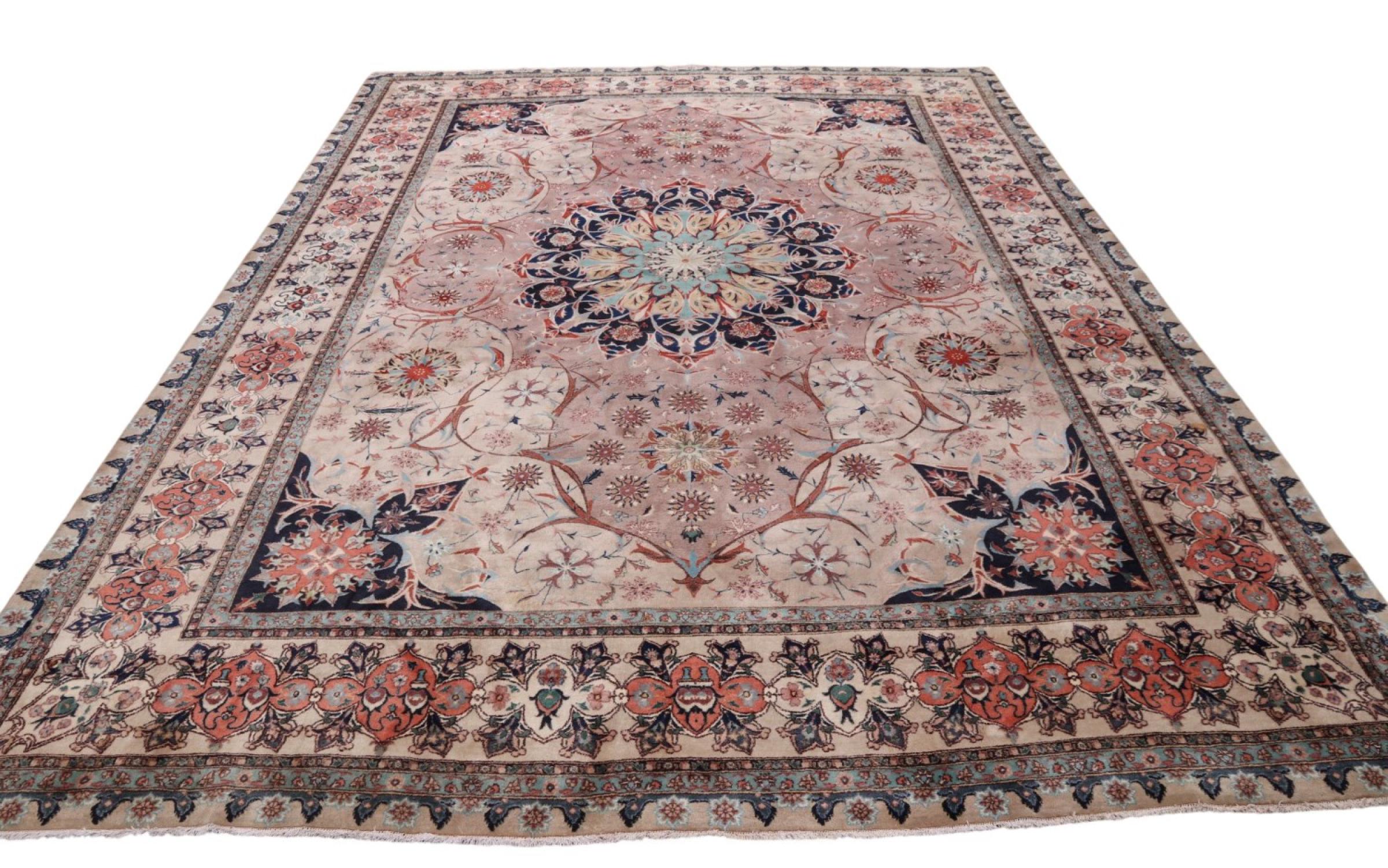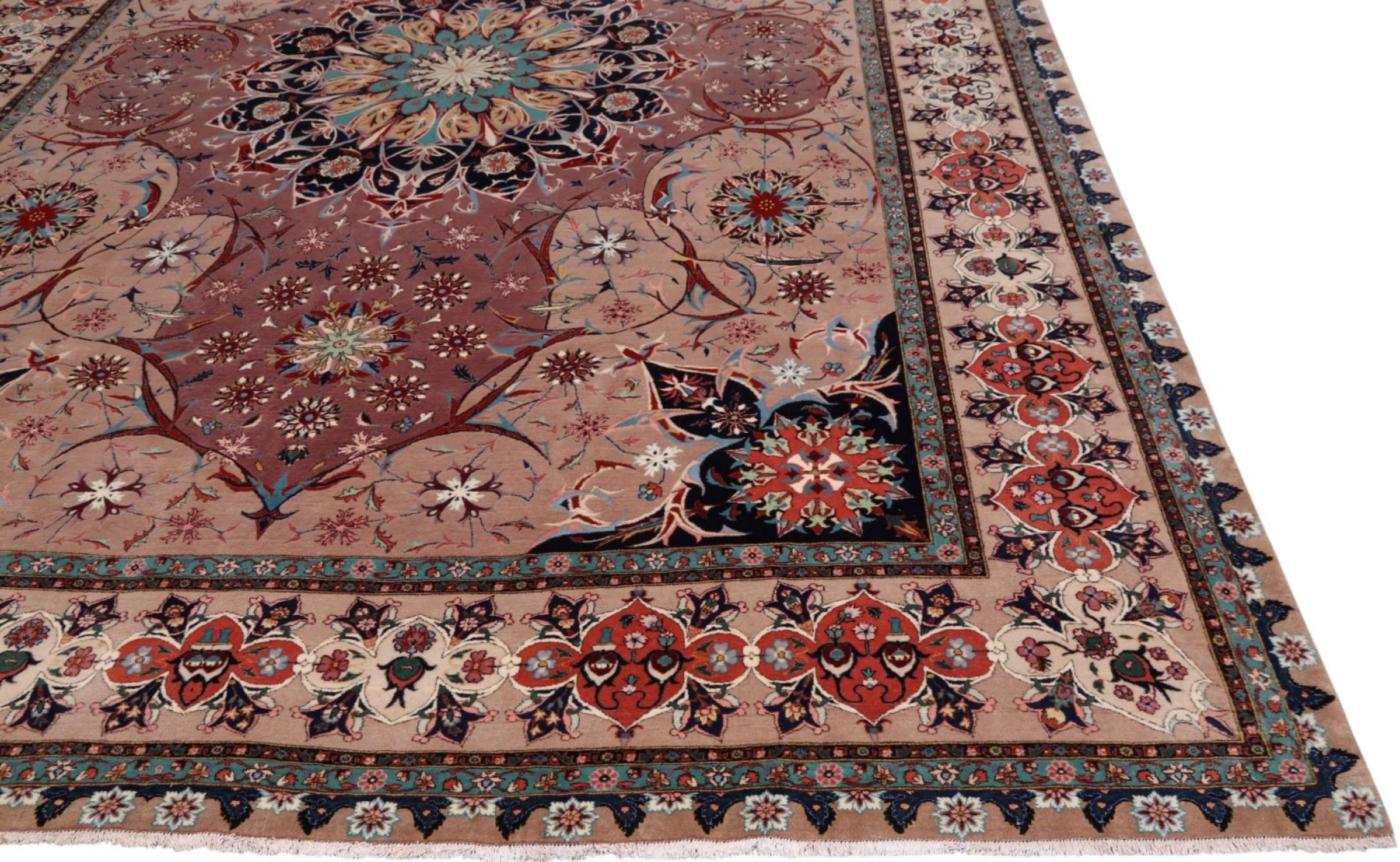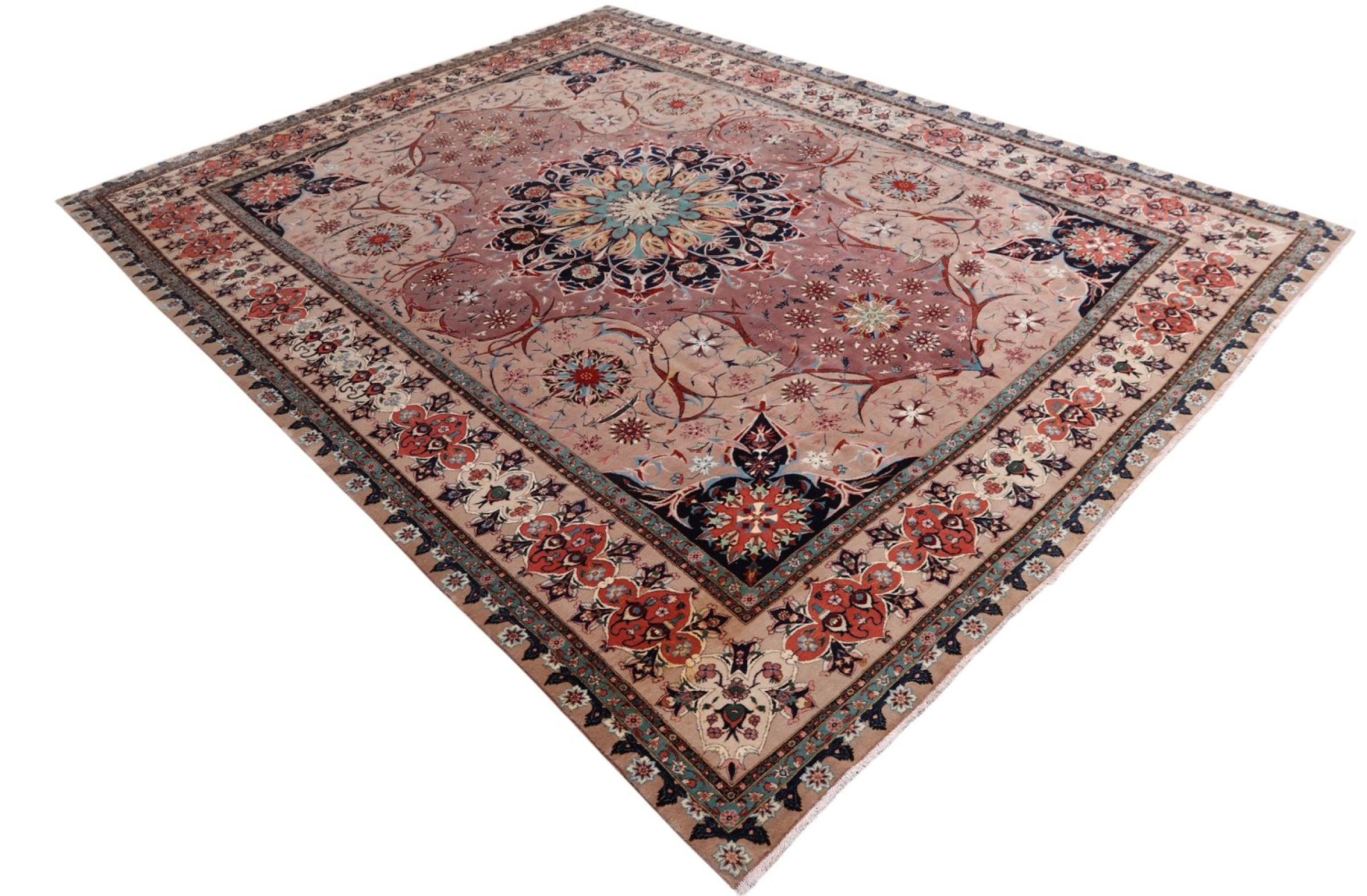 Rug ID: 291986001021856 Size: 12'7"x9'7" ft Thickness: ap. 0.28 in Knot density: 291 - 323 / square inch Manufacturing: Knotted by hand Pile: Wool with silk Warp: Cotton Origin: Persia / Iran Age: New Weight: ap. 75 lb Also know as Tabriz, Tabris, Täbris, Tebriz, Tebris, 40Raj, 50Raj In stock: Unique - Only 1 in stock