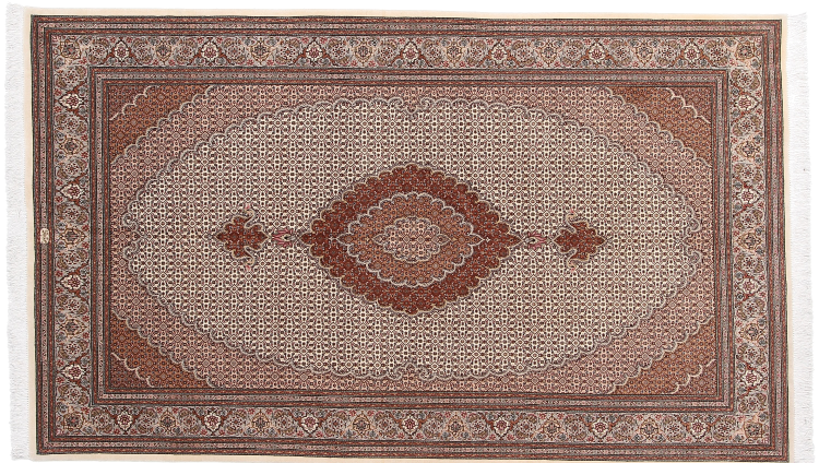 Rug ID: 42560049849 Size: 8'5"x5'0" ft Thickness: ap. 0.28 in Knot density: 387 / square inch Manufacturing: Knotted by hand Pile: Wool with silk Warp: Cotton Origin: Persia / Iran Age: New Weight: ap. 26 lb Also know as Tabris, Tabriz, Tebris, Tebriz, Täbris In stock: Unique - Only 1 in stock