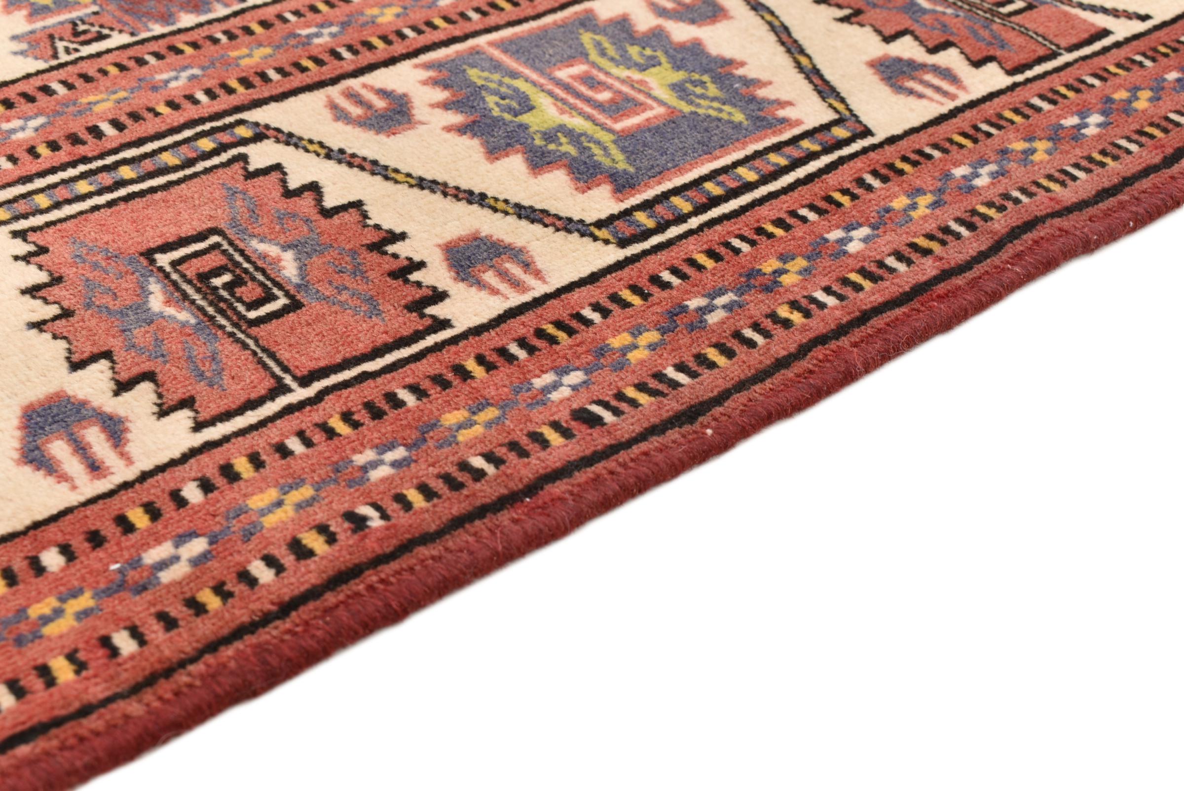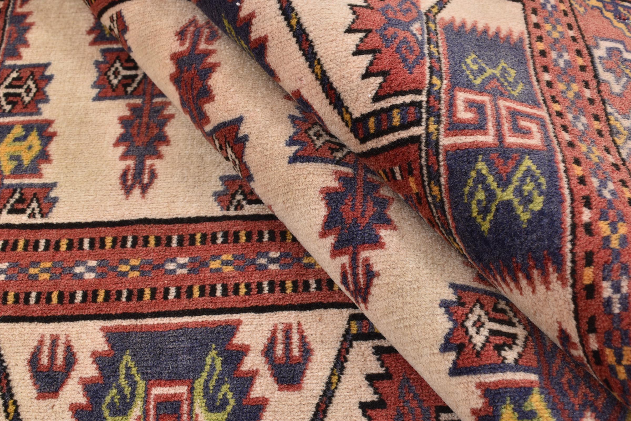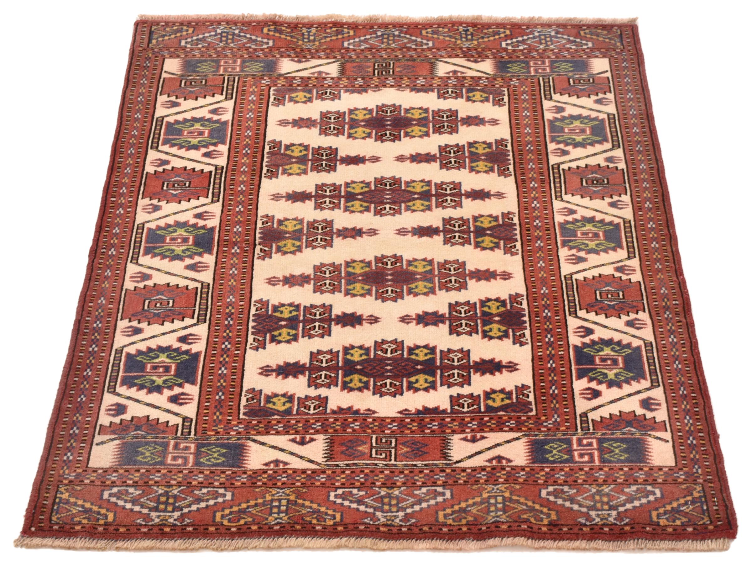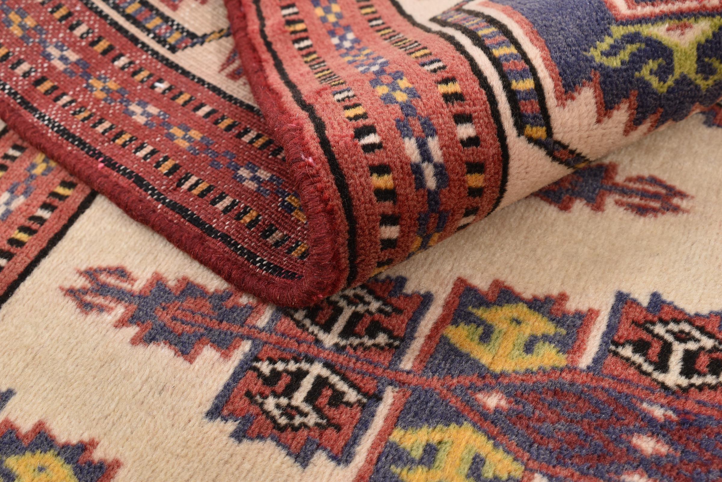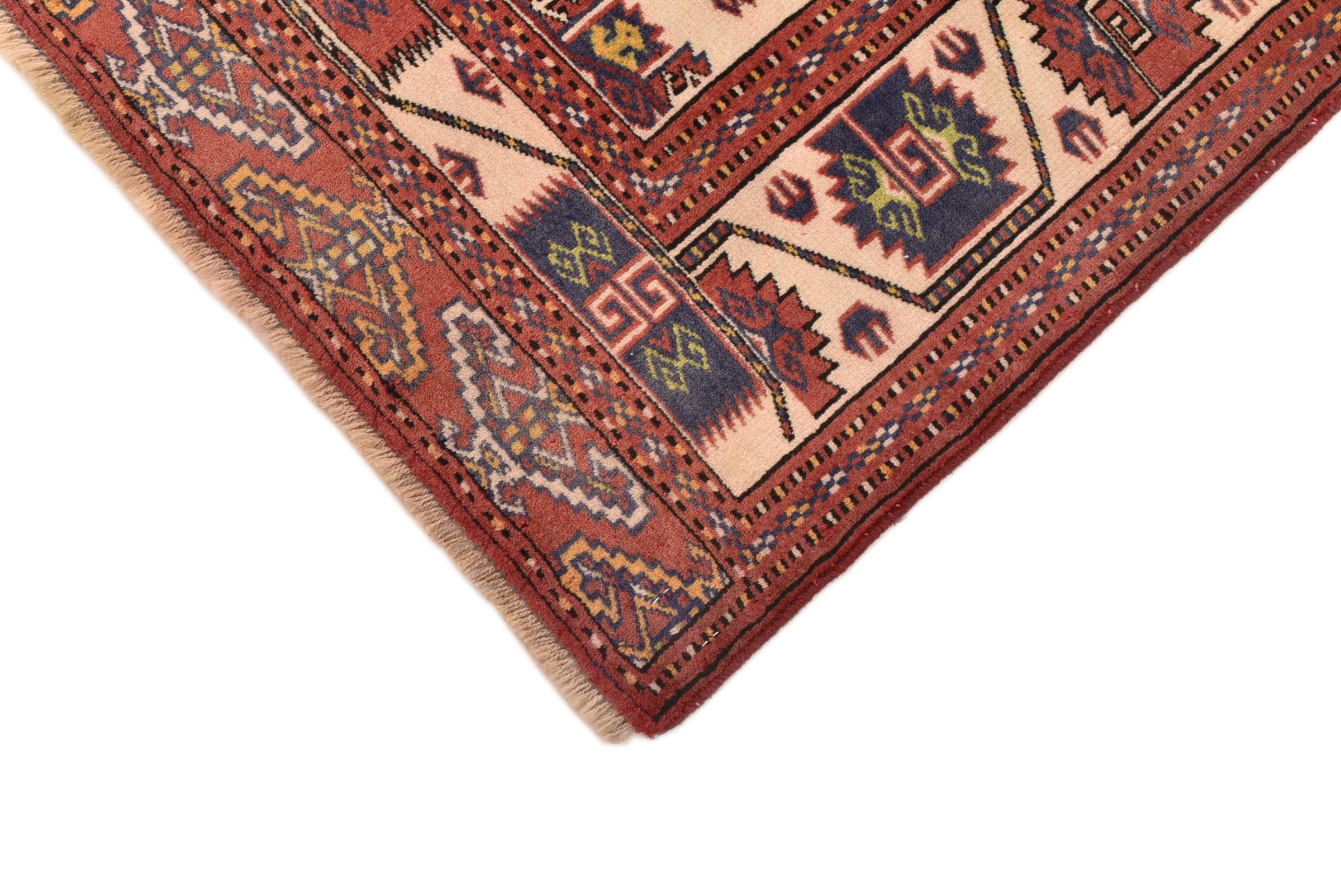 This typical Turkaman rug reminds of rugs from the neighbors Afghanistan and Pakistan. Its design consists of octagons, which are a highly popular element in this region. It has dark shades of red and is knotted by hand from sheep wool.