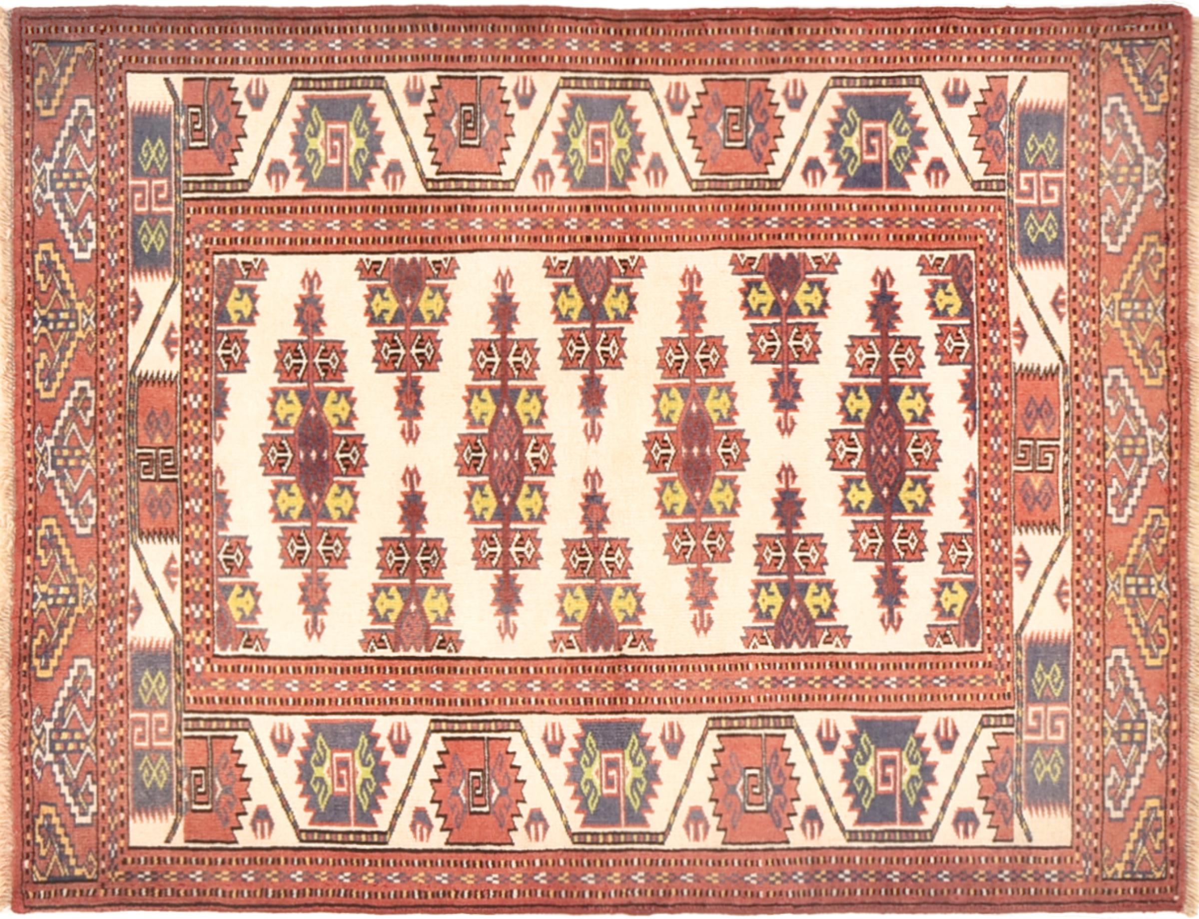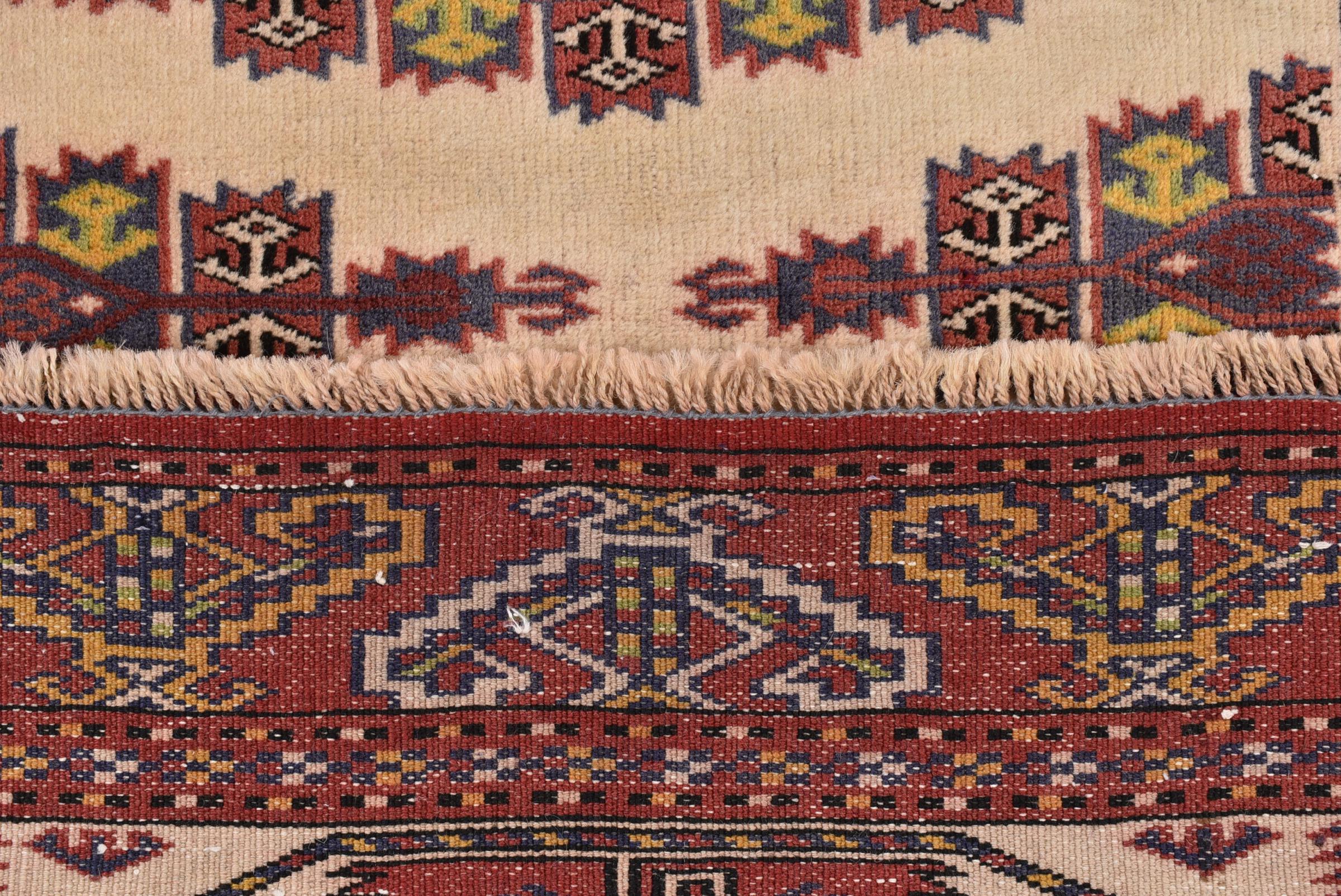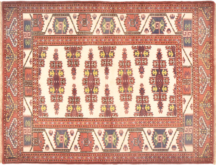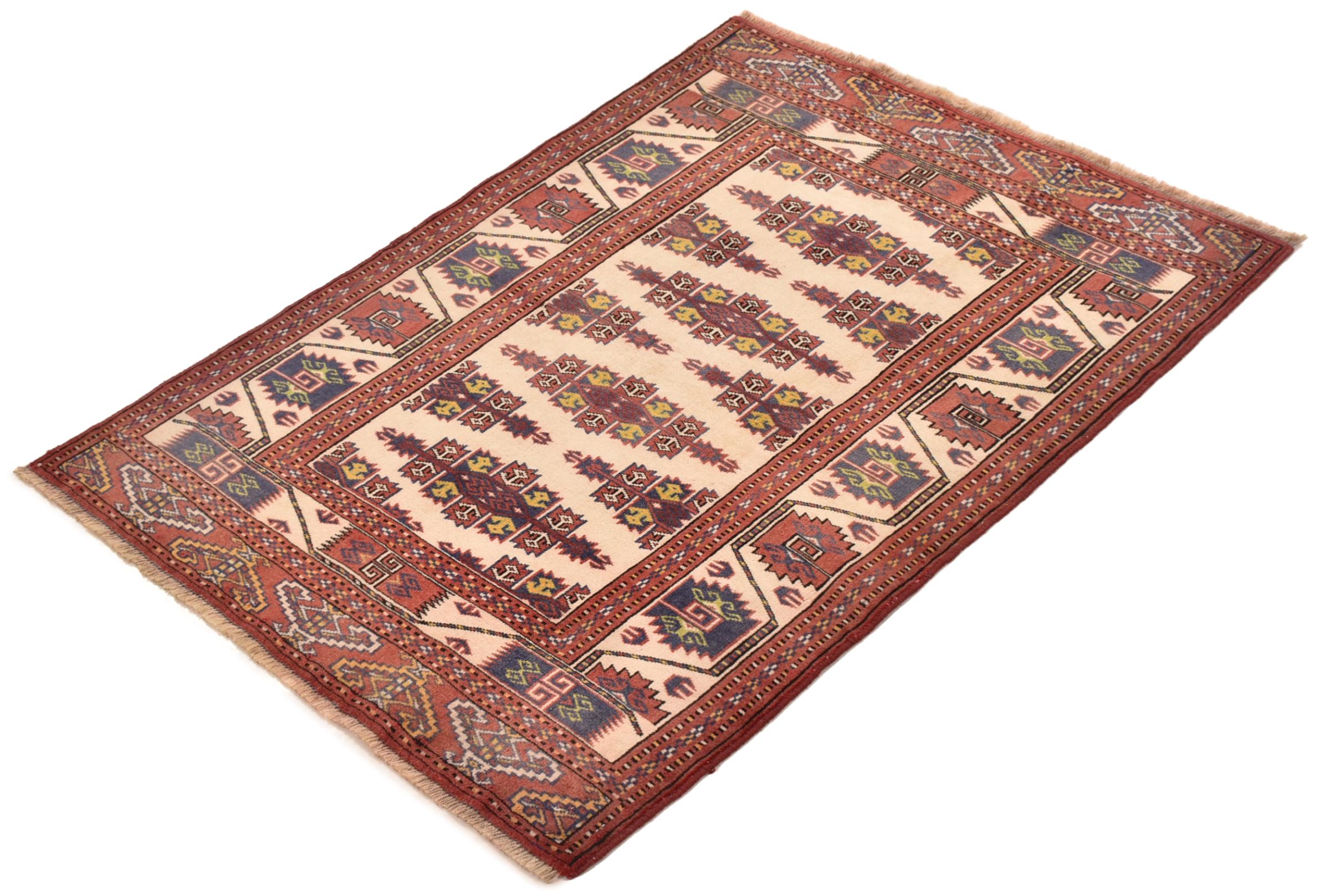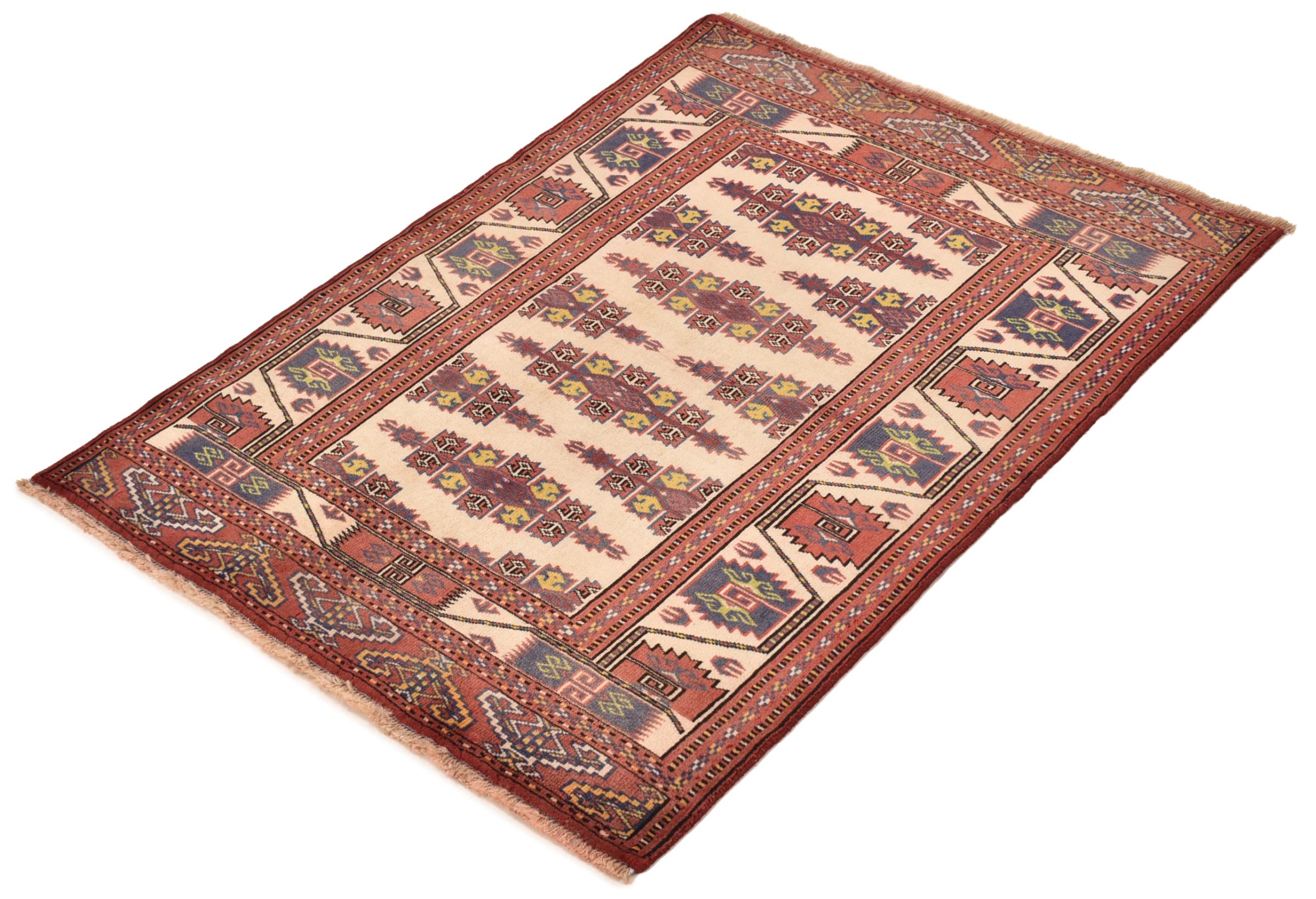 This typical Turkaman rug reminds of rugs from the neighbors Afghanistan and Pakistan. Its design consists of octagons, which are a highly popular element in this region. It has dark shades of red and is knotted by hand from sheep wool.