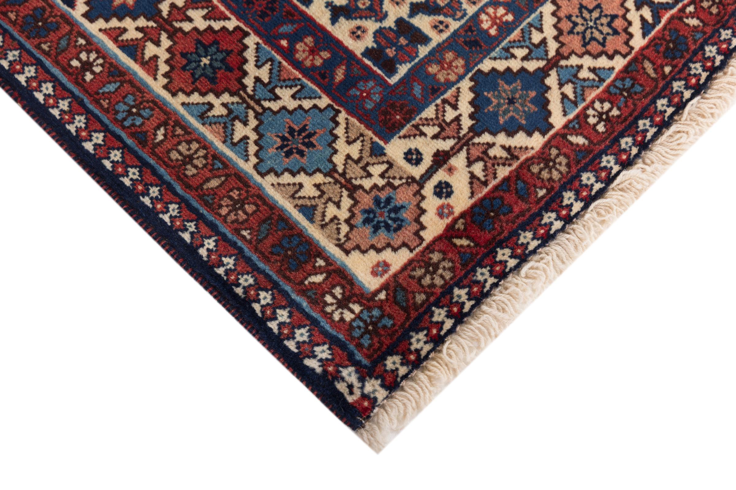 This carpet belongs to the village and nomadic carpets from Iran, the former Persia. This kind of carpets is hand knotted in smaller towns and villages in ancient tradition. Even nomads still knot Persian carpets in the open air. The carpets are knotted without a draft and entirely from memory. They are characterized by classical ornaments arranged in linear and geometric patterns. Thanks to their cultural and traditional origins, these rugs possess a unique character that embodies ancient Persia.